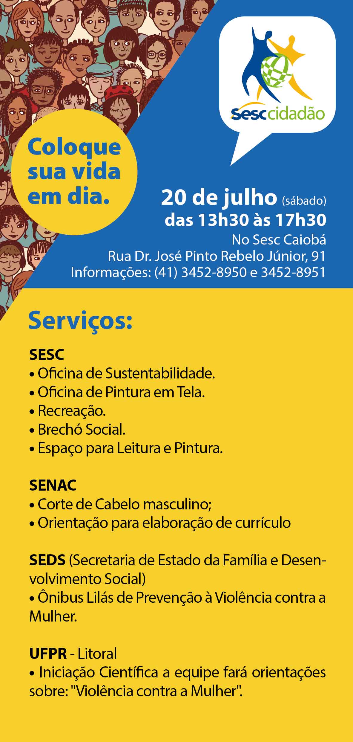 Sesc Caiobá e unidades de outros 11 municípios recebem evento no dia 20 de julho, tendo como base as áreas de atuação da entidade: assistência, saúde, lazer, educação e cultura, com foco na cidadania