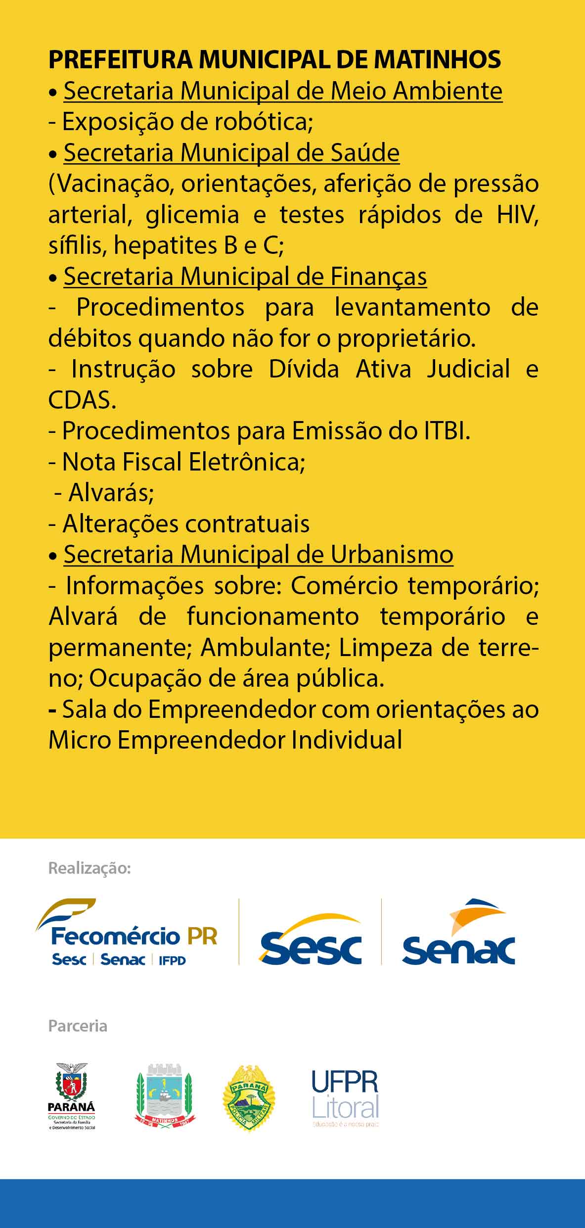 A Prefeitura de Matinhos ofertará diversos serviços, tais como exposição de robótica; vacinação, orientações de educação em saúde, aferição de pressão arterial, glicemia e testes rápidos de HIV, Sífilis, Hepatites B e C; procedimentos para levantamento de débitos quando não for o proprietário; instrução sobre Dívida Ativa Judicial e CDAS; procedimentos para Emissão do ITBI; Nota Fiscal Eletrônica; Alvarás; Alterações contratuais. Também fará parte do pacote de serviços ofertados informações sobre comércio temporário; Alvará de funcionamento temporário e permanente; Ambulante; Limpeza de terreno; Ocupação de área pública, além da Sala do Empreendedor, com orientações ao Micro Empreendedor Individual.