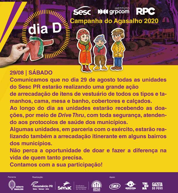 “Será uma ação de arrecadação simultânea que acontecerá em todo o estado. O Sistema Fecomércio Sesc Senac PR aproveita o Dia D para mobilizar seus parceiros e apoiadores da Campanha do Agasalho, para auxiliarem na divulgação dessa grande ação, com o objetivo de ajudar a quem mais precisa”, completa a diretora de Educação, Cultura e Ação Social do Sesc PR, Maristela Massaro Carrara Bruneri. A lista também inclui os sindicatos empresariais do comércio filiados e as Câmaras da Mulher Empreendedora e Gestora de Negócios, além das rádios MundoLivre FM e 98 FM, e dos jornais Gazeta do Povo e Tribuna do Paraná.