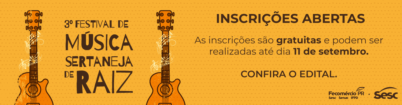 Até o dia 11 de setembro, músicos de todo o Brasil, maiores de 18 anos, podem inscrever gratuitamente músicas, composições instrumentais ou canções para a terceira edição do Festival de Música Sertaneja de Raiz promovido pelo Sesc PR.