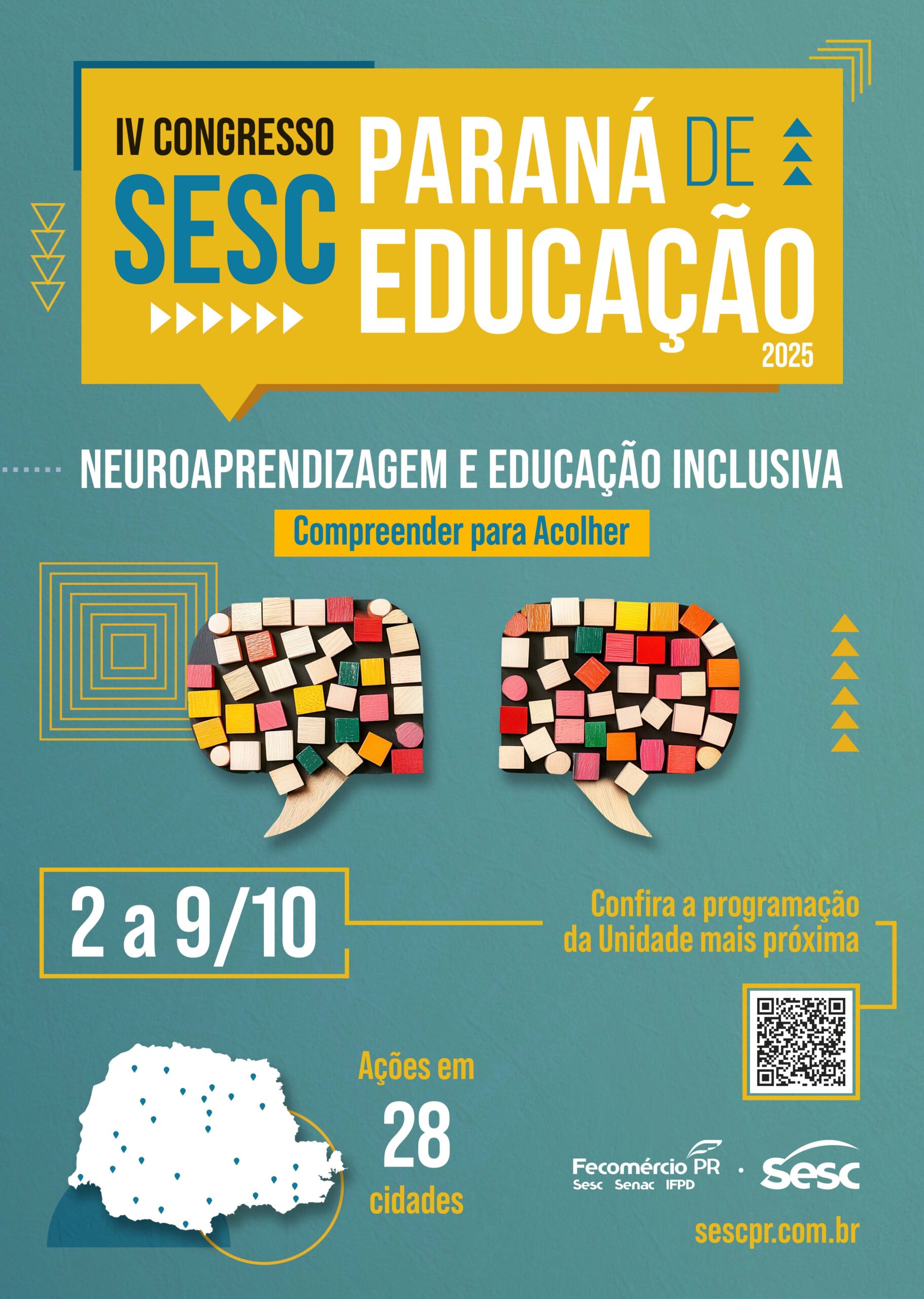 O Sesc Paraná dá início nesta quinta-feira, 2 de outubro, à quarta edição do seu Congresso de Educação, que neste ano tem como tema “Neuroaprendizagem e Educação Inclusiva: Compreender para acolher”. A programação será realizada até o dia 9 de outubro em 28 Unidades de Serviço do Sesc em todo o estado, reunindo educadores, gestores, estudantes e profissionais interessados em refletir sobre práticas mais inclusivas e eficazes no processo de ensino-aprendizagem.