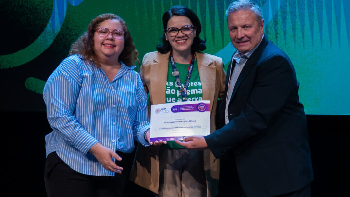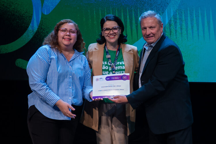 Durante a cerimônia de premiação, o diretor de Esporte, Lazer e Saúde do Sesc PR, Marcus Vinicius de Mello, e a analista da área de Serviço Social do Sesc Mesa Brasil, Maria Bernadete Reis Maia, representaram a instituição na premiação.