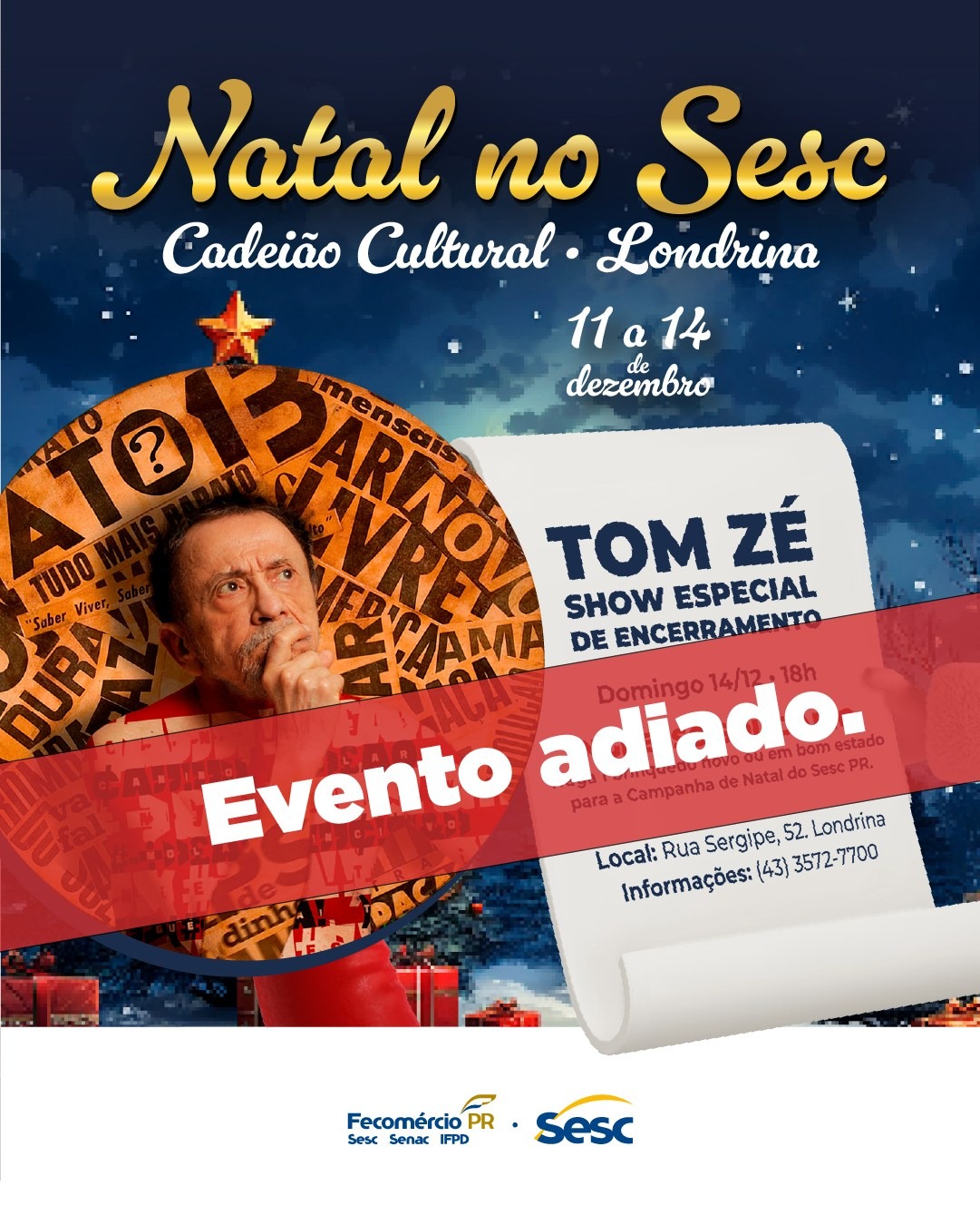 Diante dessas previsões meteorológicas, o show do cantor Tom Zé, inicialmente programado para domingo (14), às 18h, não será realizado nesta data. Novas informações sobre a remarcação das atividades serão divulgadas em breve nos canais oficiais do Sesc Paraná.