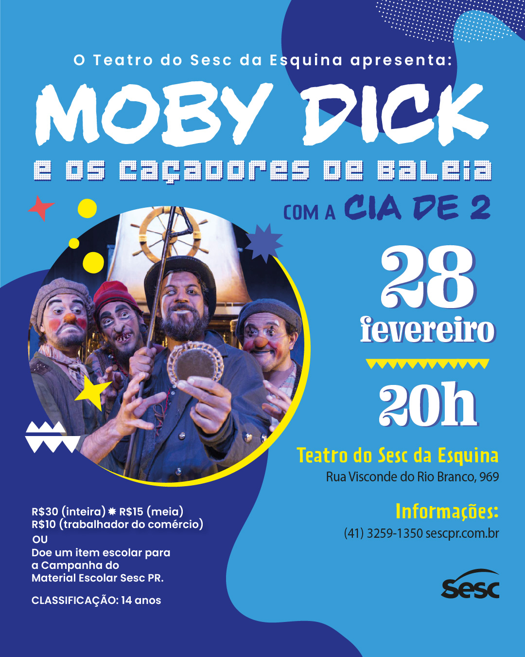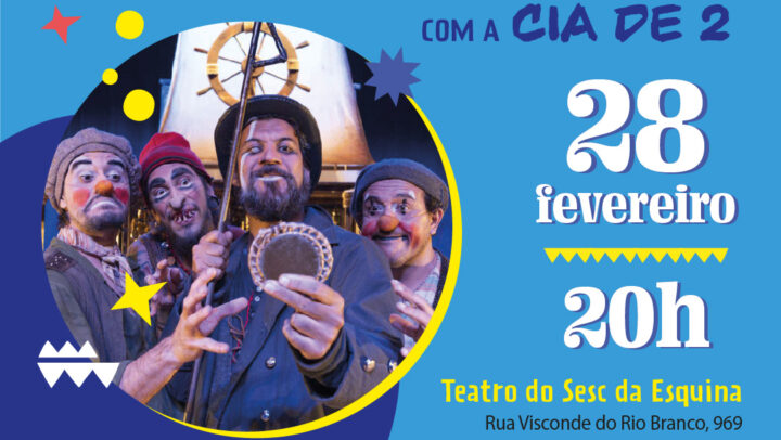 O romance épico de Herman Melville chega ao Teatro do Sesc da Esquina com Moby Dick & Os Caçadores de Baleia – uma releitura cômica e familiar do Grupo Cia. de 2. A peça será apresentada no sábado (28), às 20h, e conta a história de três palhaços marinheiros que estão à deriva e relembram as histórias de seu capitão Ahab. A sede de vingança do capitão os levou à jornada perigosa com um único objetivo: caçar Moby Dick, a baleia que arrancou sua perna e o arrastou para as profundezas do mar.