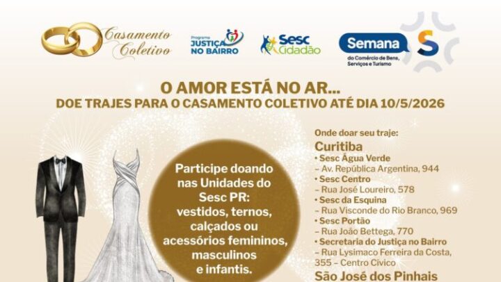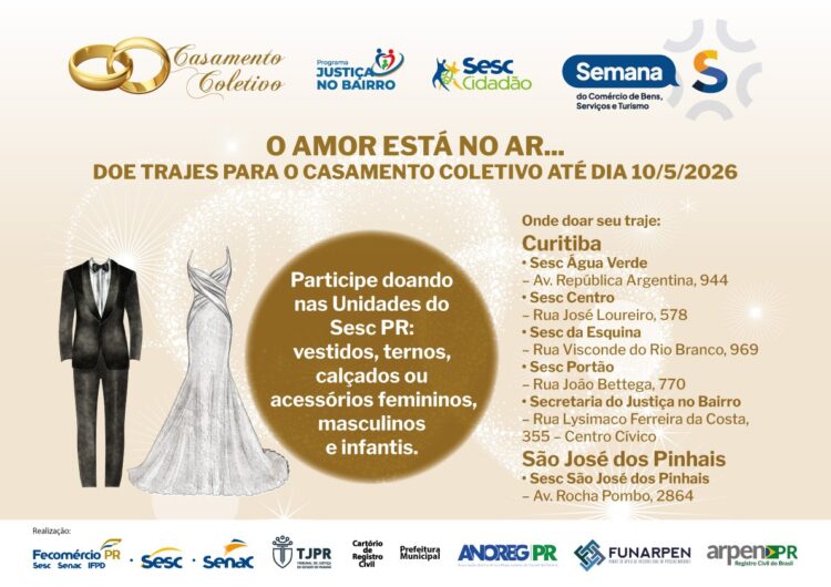 A população pode doar vestidos de noiva, ternos, calçados e acessórios femininos, masculinos ou infantis até o dia 10 de maio. O casamento coletivo será realizado no dia 17 de maio, no Sesc São José dos Pinhais, reunindo casais que terão a oportunidade de oficializar gratuitamente sua união.