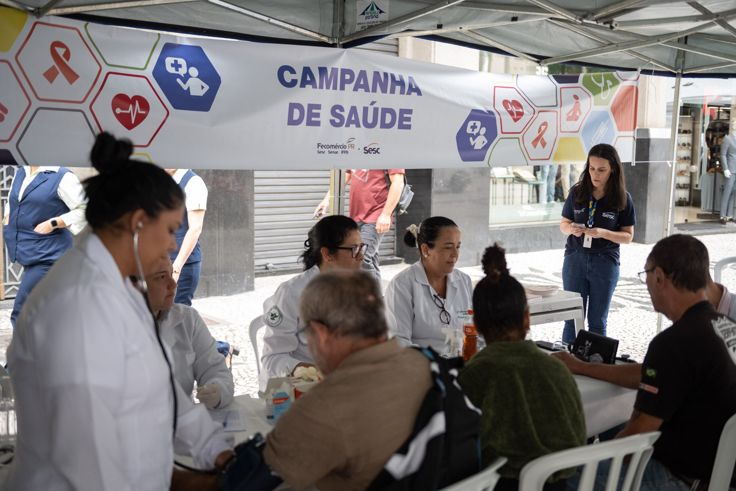 A Campanha de Saúde no centro de Curitiba foi organizada pelas unidades Água Verde, Centro, Esquina e Portão do Sesc PR e contou com a parceria de instituições como o Instituto de Hanseníase, o Colégio Rui Barbosa, a Secretaria Municipal da Mulher e Igualdade Racial (SMIR), o CRN Jovem e a Instituto Aliança Contra Hanseníase.