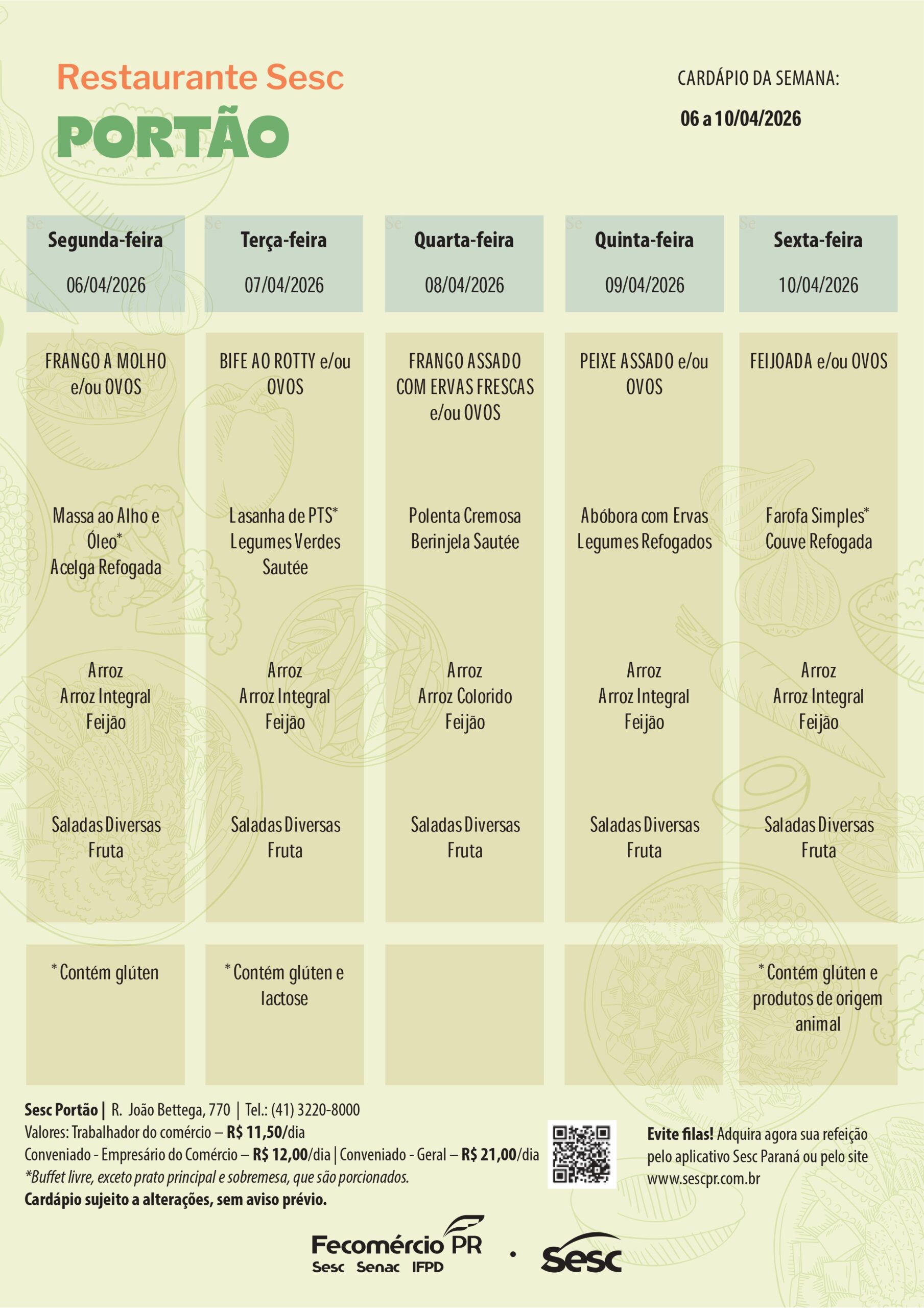 *A capacidade máxima de atendimento do restaurante Sesc Portão é de 230 refeições (consumo local + viagem), portanto, o fechamento pode ser antecipado quando atingido esse limite.