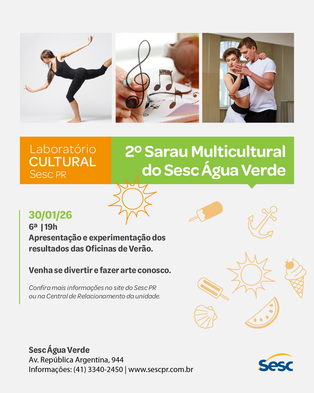 O 2º Sarau Multicultural do Sesc Água Verde é uma mostra de experimentações em diversas linguagens artísticas, como dança, teatro, artes visuais e música. O evento é o resultado de uma semana intensa de oficinas promovidas pelos Laboratórios Culturais do Sesc Água Verde. Venha se divertir conosco e experimentar novas linguagens. Descubra o artista em você!