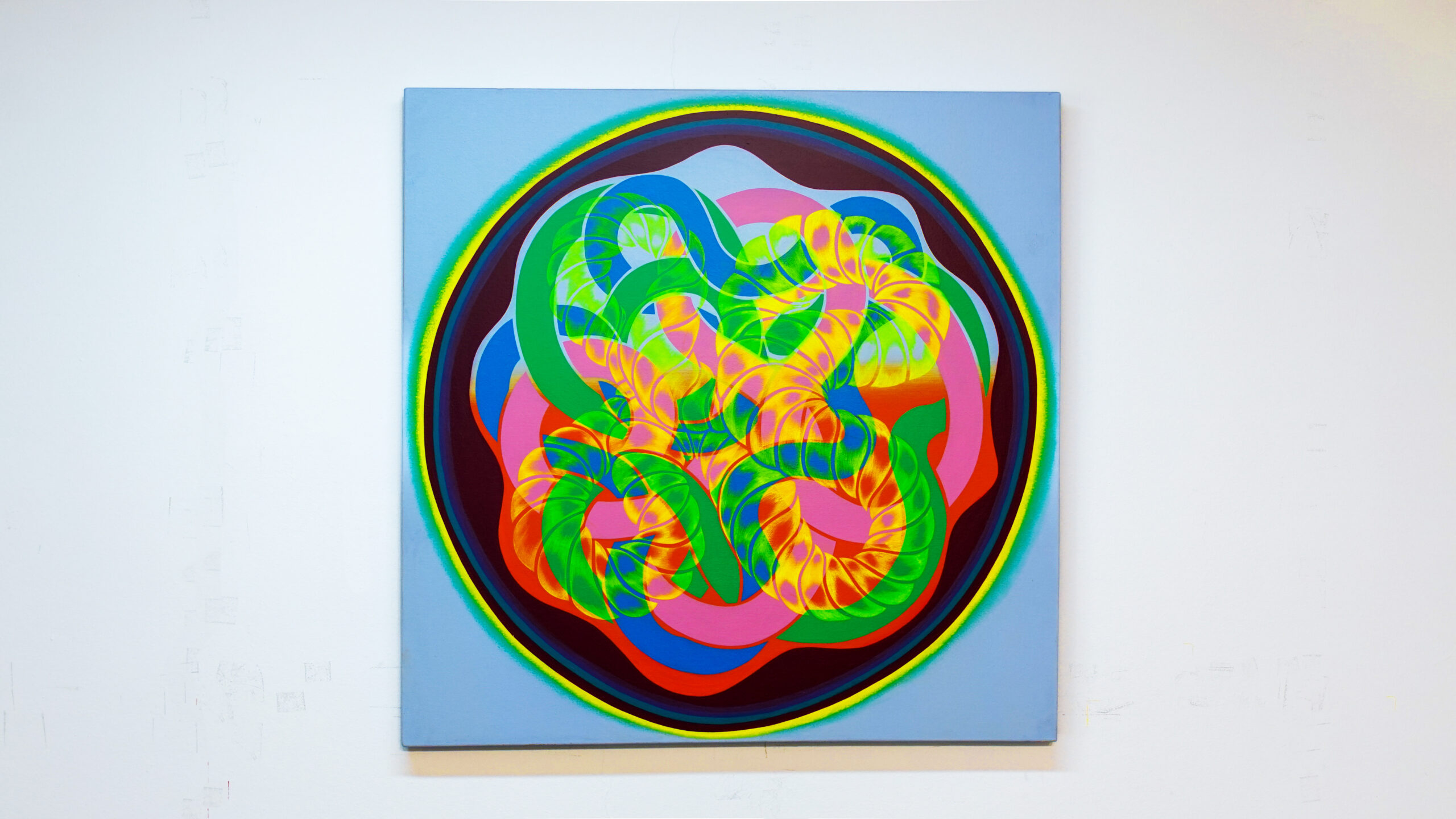 Paulo Kurazumi (São Bernardo do Campo, SP) vive e trabalha em Sorocaba, no interior paulista. Desde a conclusão de sua pós-graduação em História da Arte na Faap (São Paulo, 2013), o artista se dedicou à prática de ensinos em ateliês coletivos, tendo lecionado na Pinacoteca de São Bernardo do Campo. Formas espiraladas, serpentes sem cabeça e cores vibrantes são formas do sublime movimento infinito que Paulo Kurazumi encontrou por meio meditação em Bhakti Yoga para criar pinturas de dimensão poética espiritual. O artista convida o observador ao transe meditativo por meio da pintura, valendo-se pela teoria que todos somos partículas do tempo, em que corpo, alma, imaginação, sonho e amor se manifestam como expressões transcendentais.