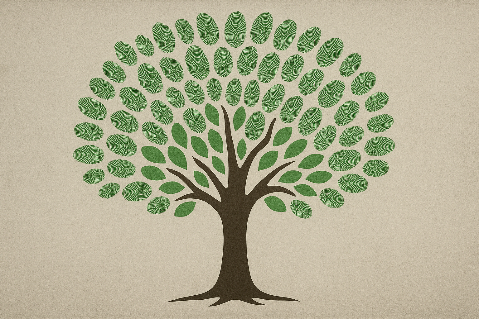 Criação de Nossa Árvore de Memórias será uma atividade coletiva em que cada participante deixa sua marca por meio de digitais em tinta, formando juntos uma grande árvore simbólica.