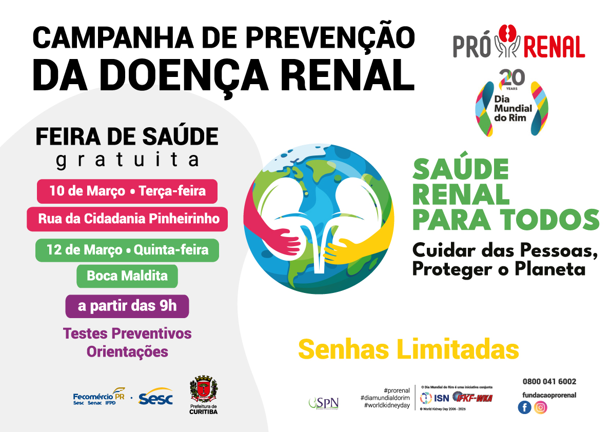 Nos dias 10 e 12 de março, o Sesc PR, em parceria com a Fundação Pró-Renal e da Prefeitura de Curitiba, promove ações especiais em alusão ao Dia Mundial do Rim, com atividades gratuitas e abertas à população.