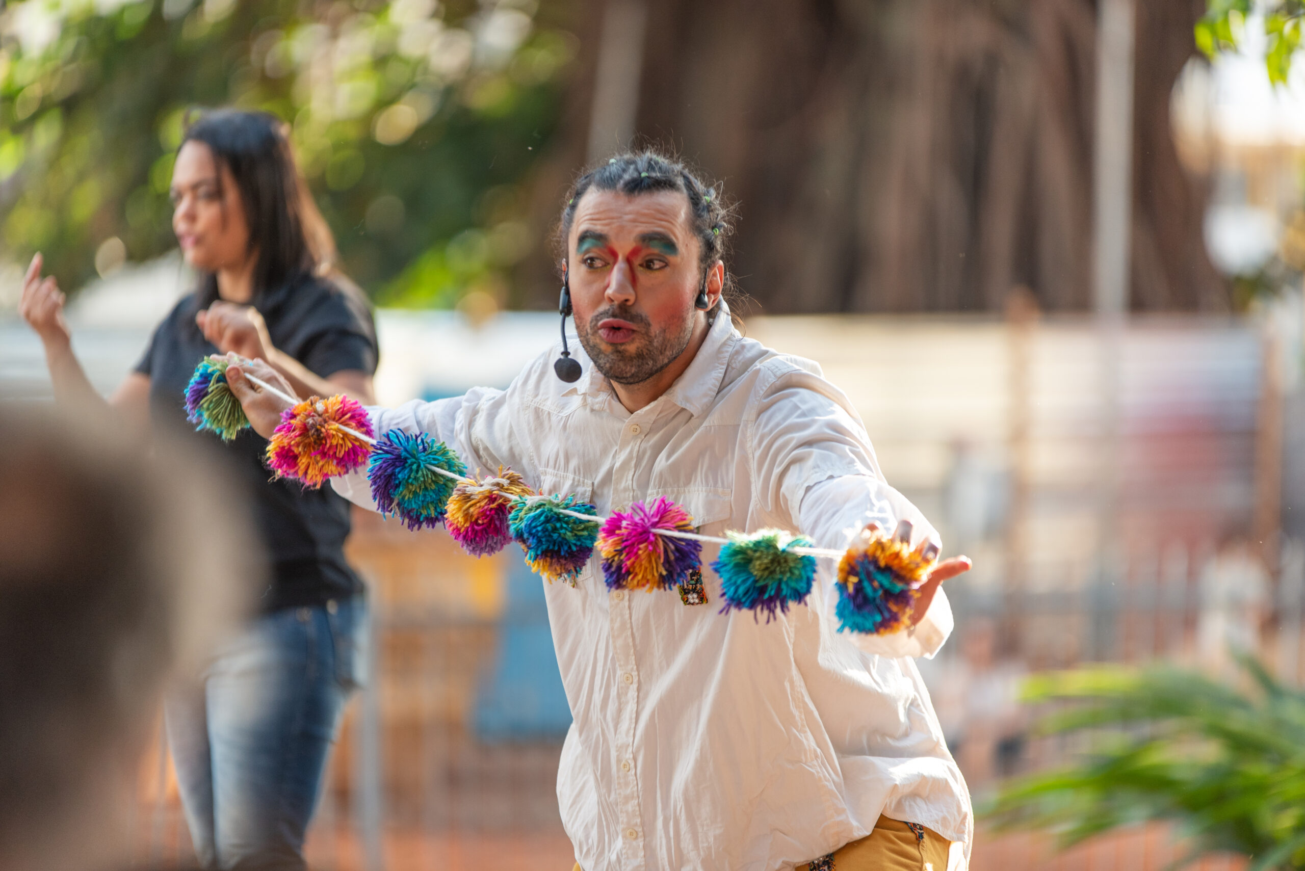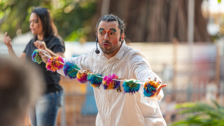 Mbyky – recontando histórias surge no aprendizado de ser artistas e pais do pequeno Joaquim que gosta de ouvir e contar histórias. O seu interesse e seu imaginário que aflorava cotidianamente a partir de narrativas lidas ou inventadas fizeram emergir borbulhas na cabeça de seus pais, Edu e Tom. O encantamento de suas narrativas possibilitou o encontro com a também artista e mãe do pequeno Davi, a Tata. E juntos, eles e ela bordaram a partir da geografia do Lago Titicaca, patrimônio histórico cultural de nossa Abya Yala (Terra em Florescimento) e, as cosmovisões andinas dos povos aimarás, a criação cênico-narrativa.