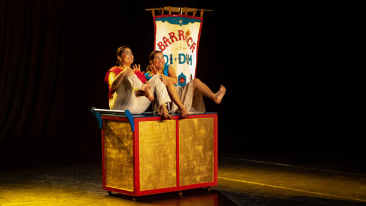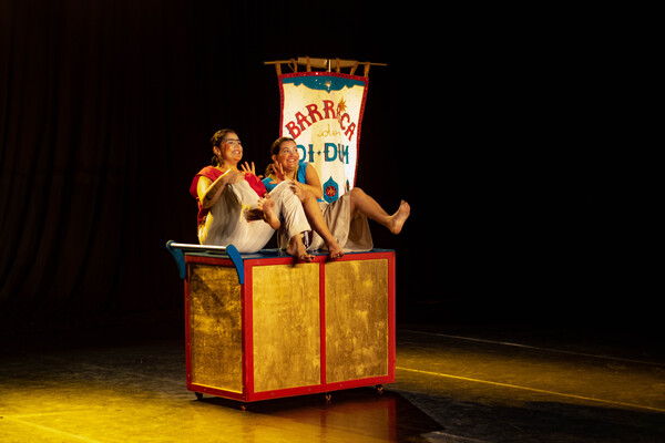 No palco, a cumplicidade com o público é o fio condutor: objetos comuns se transmutam em relíquias cheias de significados e memórias. A “Barraca Viajadora do Di-Dum” — ora feira, ora barco — abriga os elementos cênicos que alimentam a aventura protagonizada por Di e Dum, dois feirantes que transformam suas “lorotas” em instrumentos de venda.