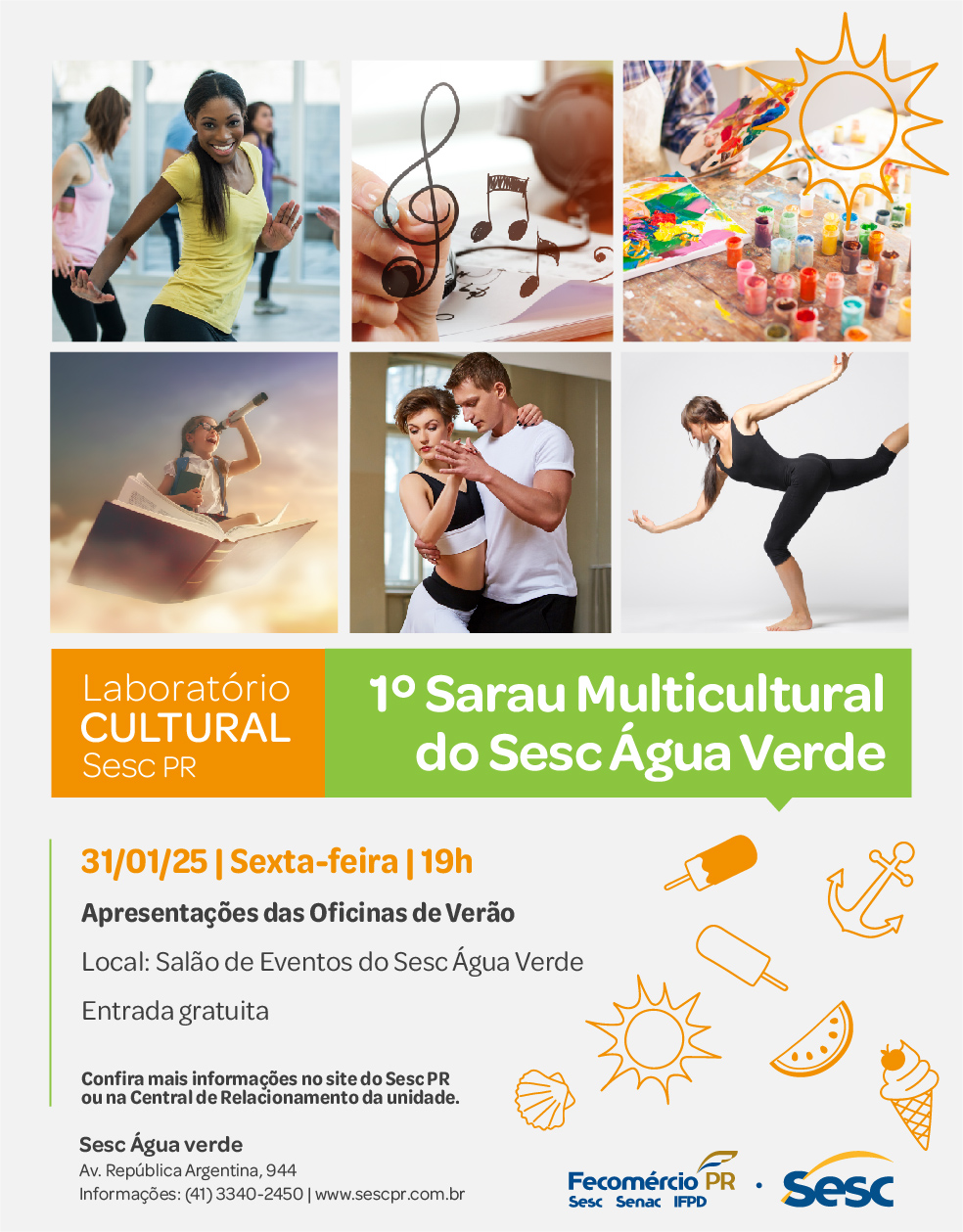 O 1º Sarau Multicultural do Sesc Água Verde é uma mostra de experimentações em diversas linguagens artísticas, como dança, contação de histórias, artes visuais e música. O evento é o resultado de uma semana intensa de oficinas promovidas pelos Laboratórios Culturais do Sesc Água Verde. Venha se divertir conosco e experimentar novas linguagens. Descubra o artista em você!