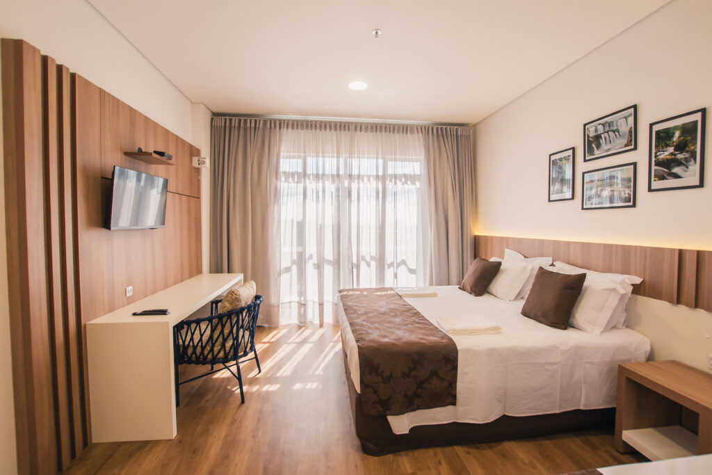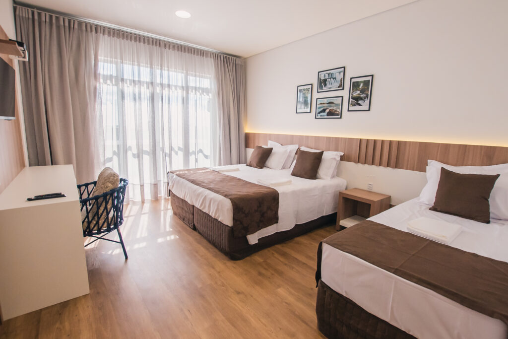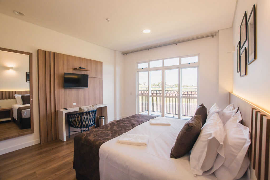 Acomoda até 3 adultos ou 2 adultos com 1 criança de até 12 anos. Essa categoria oferece opções com vista para as piscinas, para a área de preservação permanente ou para a rodovia, todos com sacada. Equipado com TV, frigobar e telefone.
