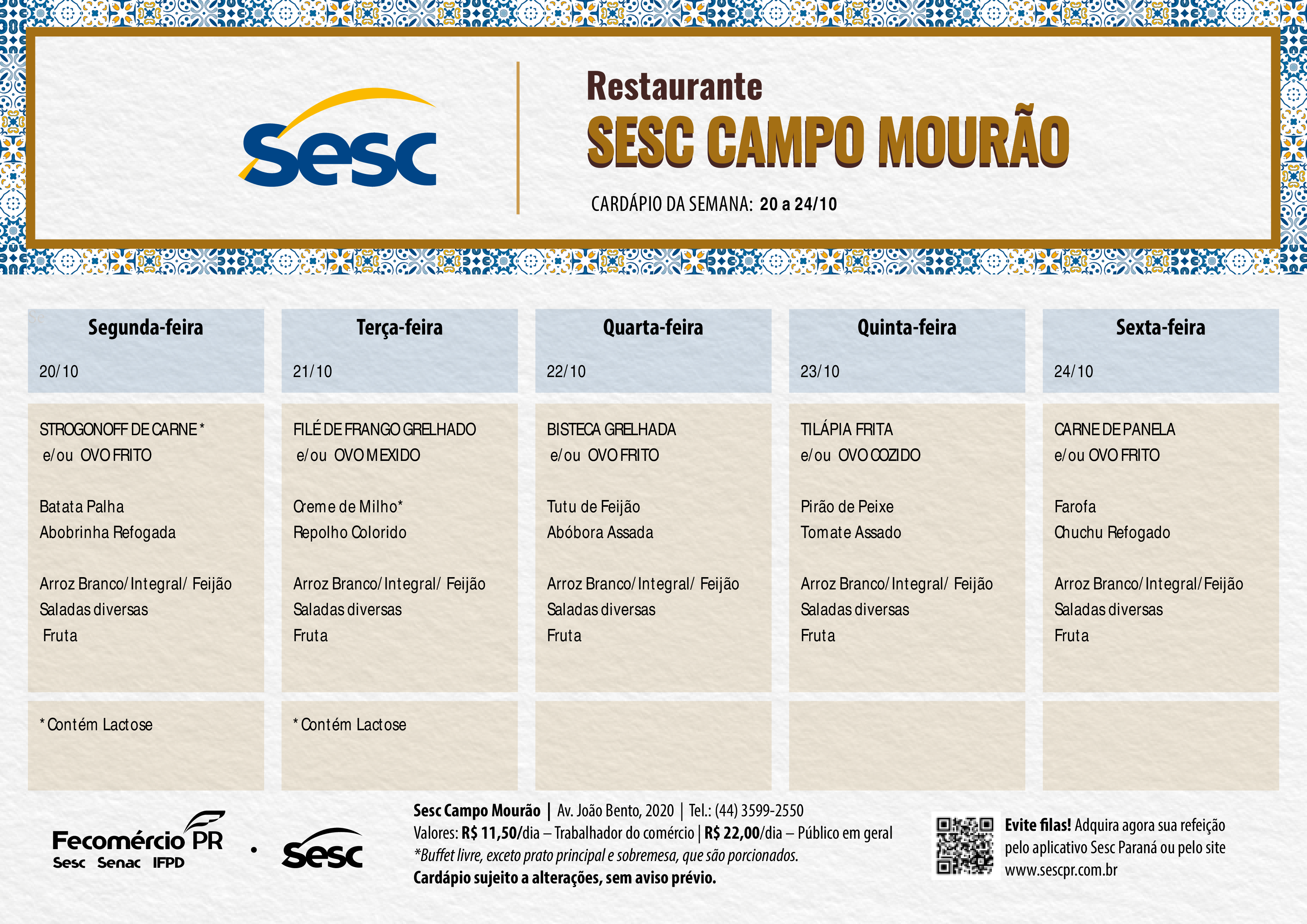 A capacidade máxima de atendimento do restaurante Sesc Campo Mourão é de 230 refeições. Portanto, o fechamento pode ser antecipado quando atingido esse limite.