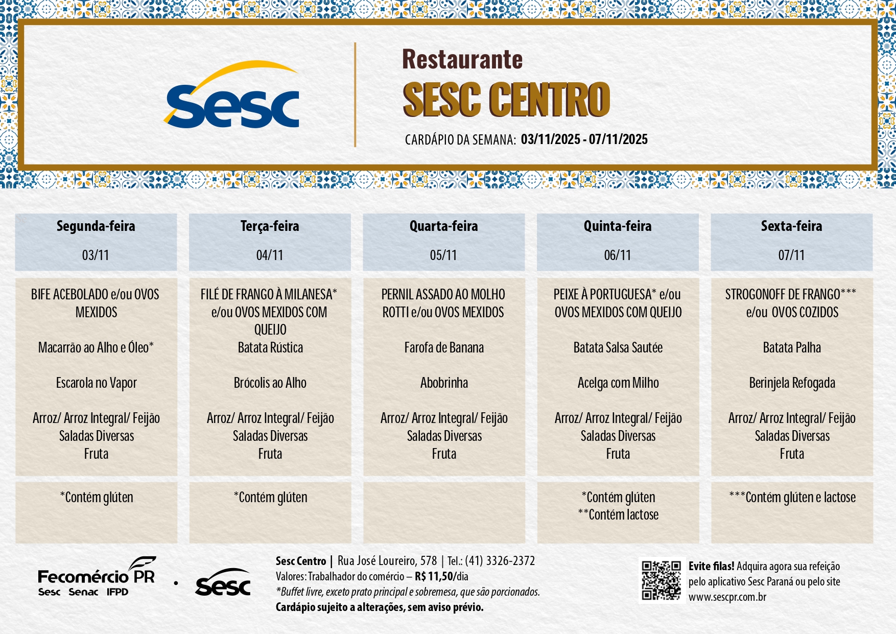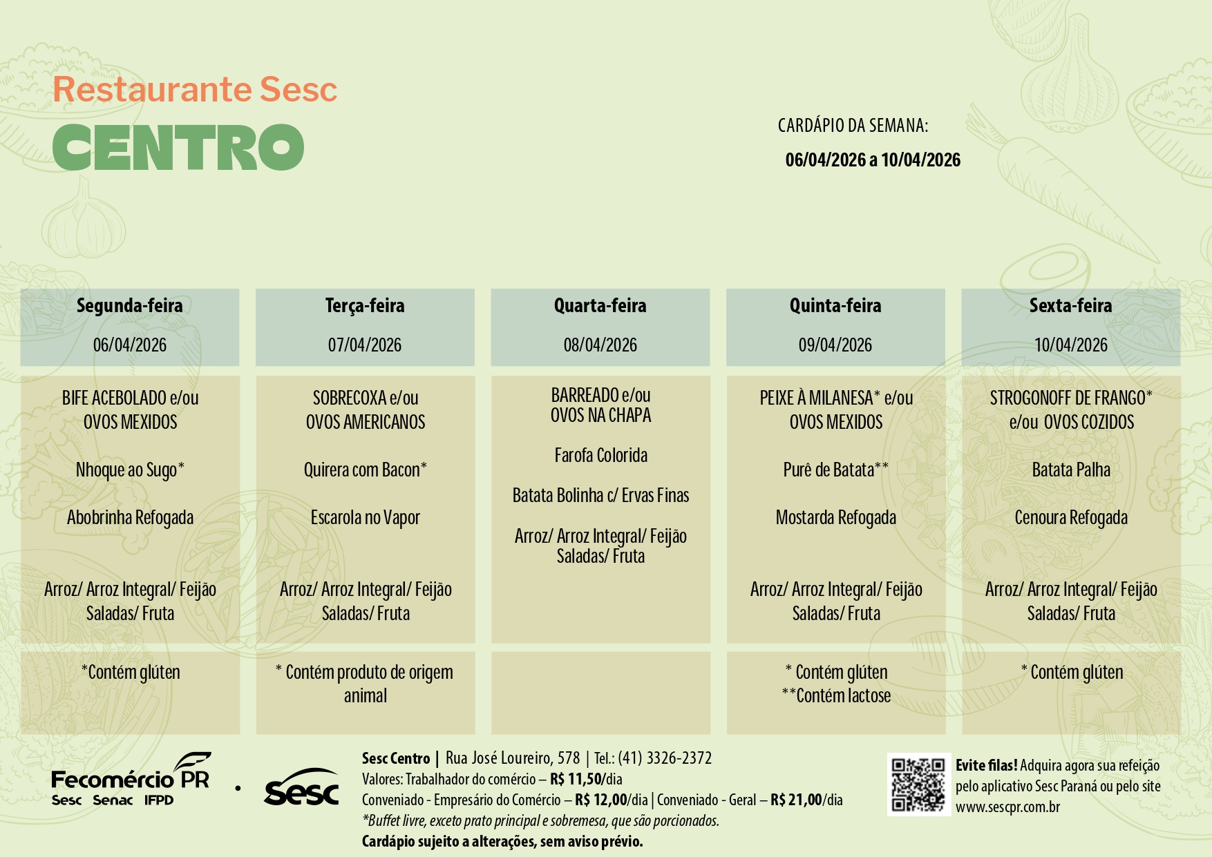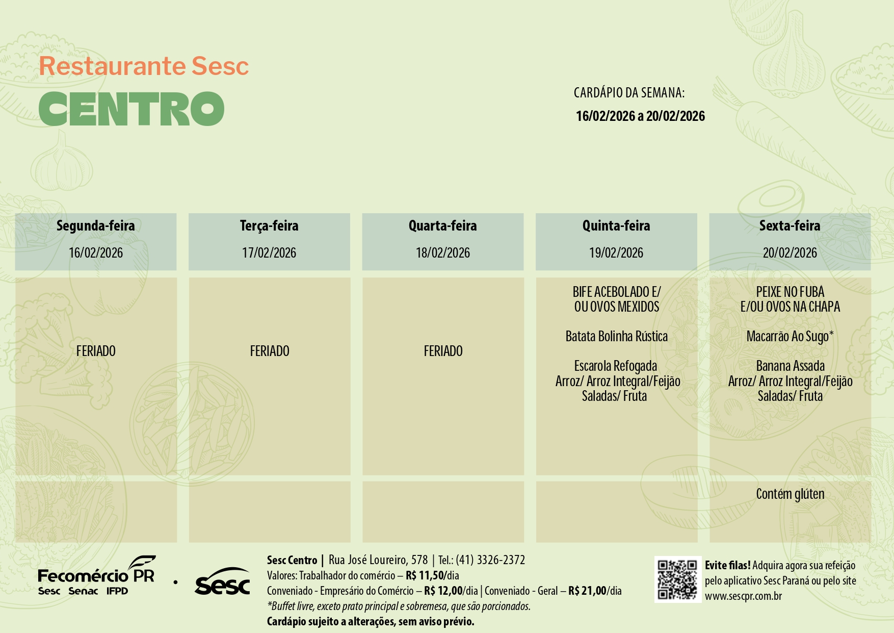 *A capacidade máxima de atendimento do restaurante Sesc Centro é de 600 refeições, portanto, o fechamento pode ser antecipado quando for atingido esse limite.