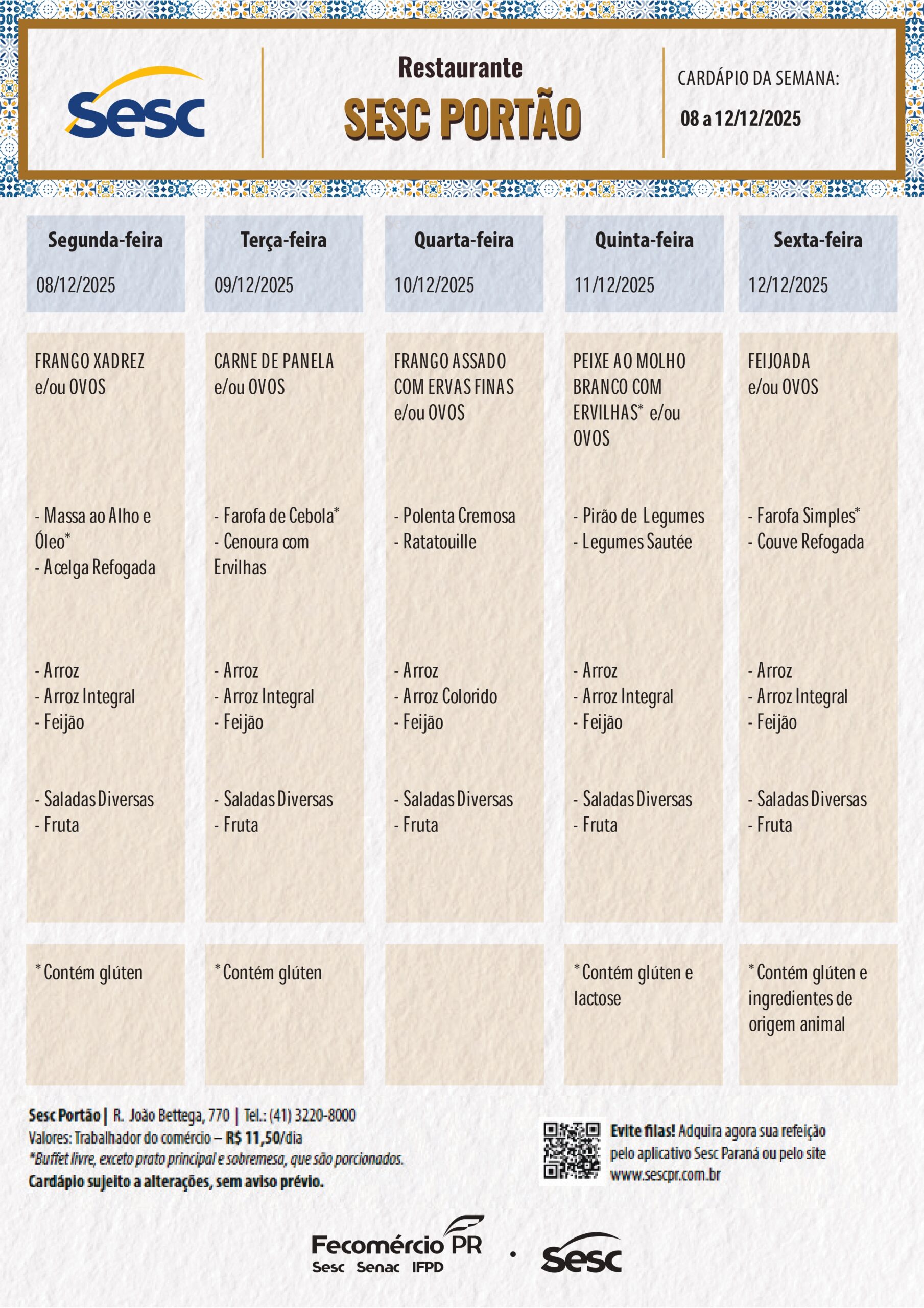 *A capacidade máxima de atendimento do restaurante Sesc Portão é de 230 refeições (consumo local + viagem), portanto, o fechamento pode ser antecipado quando atingido esse limite.