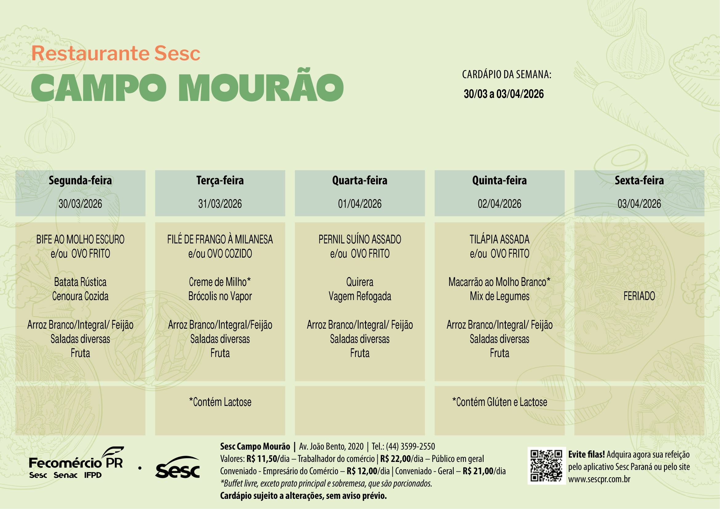 A capacidade máxima de atendimento do restaurante Sesc Campo Mourão é de 230 refeições. Portanto, o fechamento pode ser antecipado quando atingido esse limite.