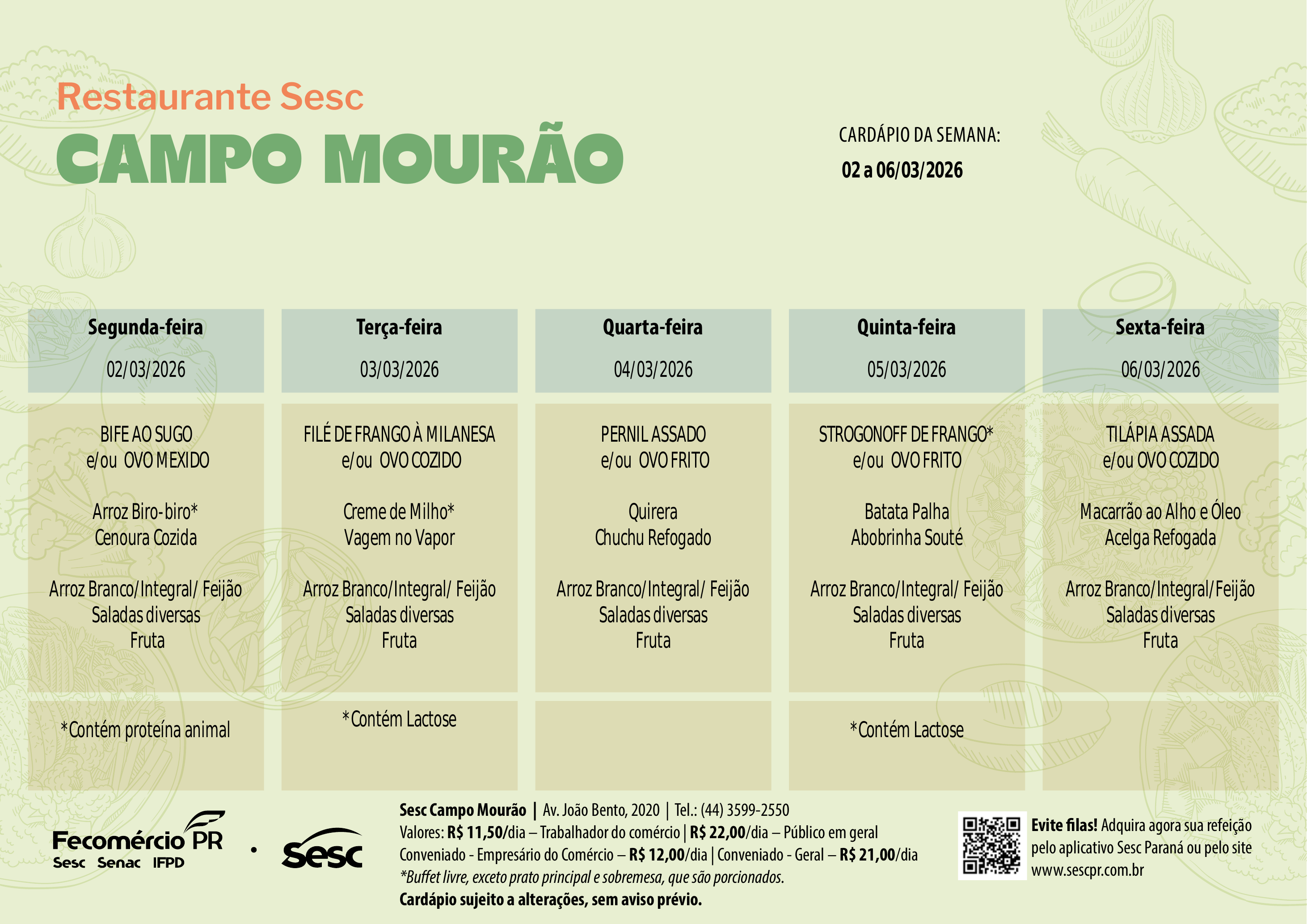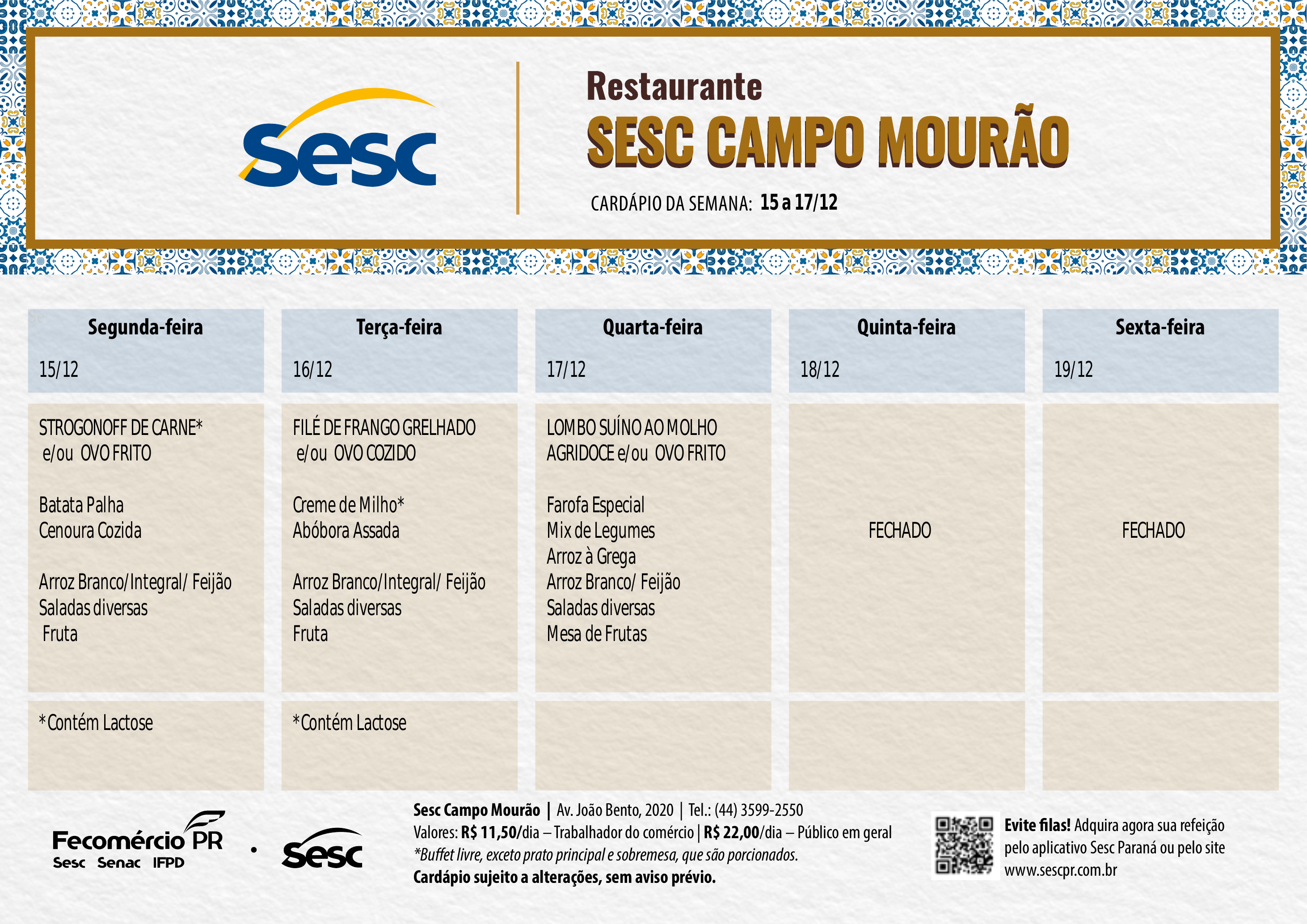 A capacidade máxima de atendimento do restaurante Sesc Campo Mourão é de 230 refeições. Portanto, o fechamento pode ser antecipado quando atingido esse limite.
