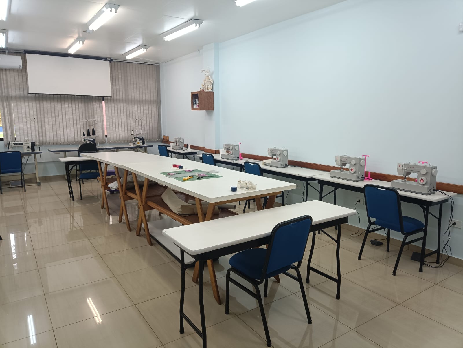 O espaço tem capacidade para 8 alunos por turma, e conta com máquinas domésticas e industriais.