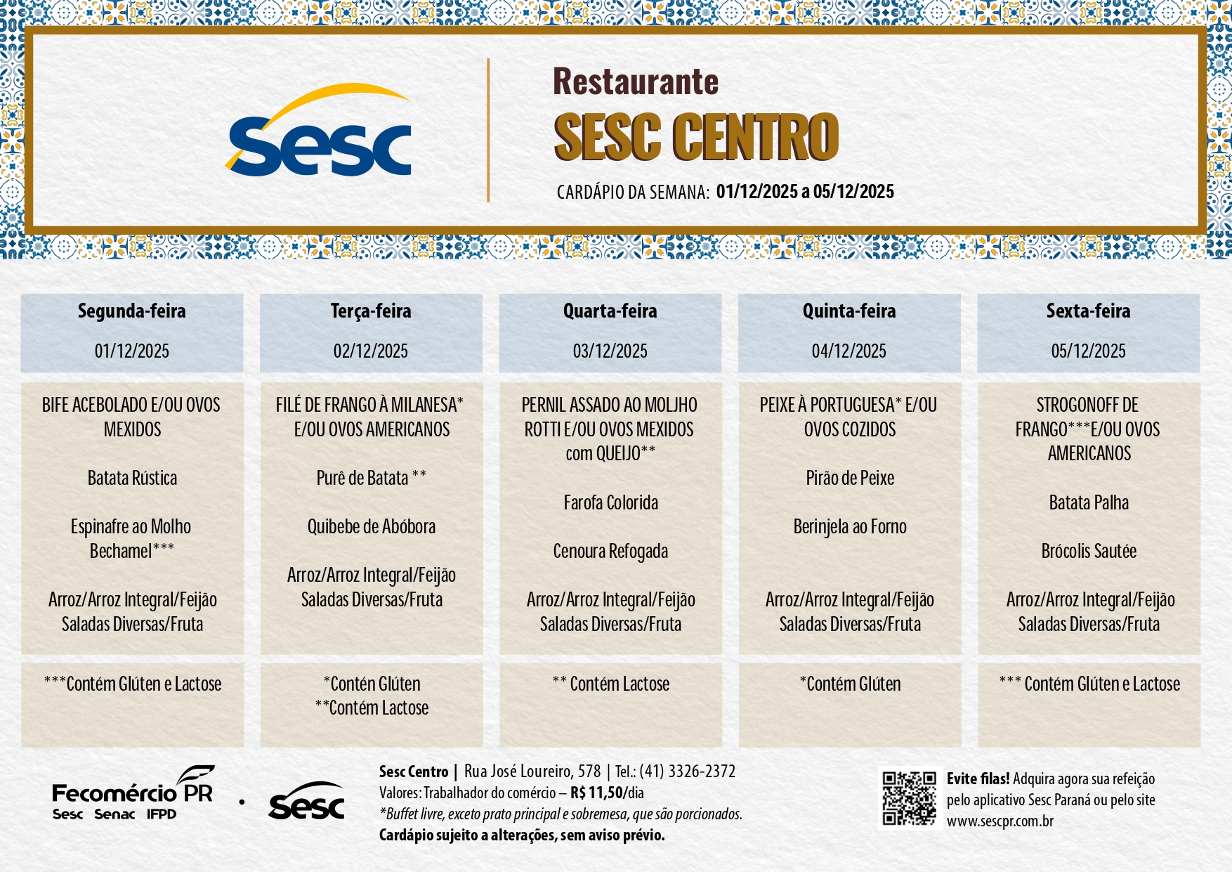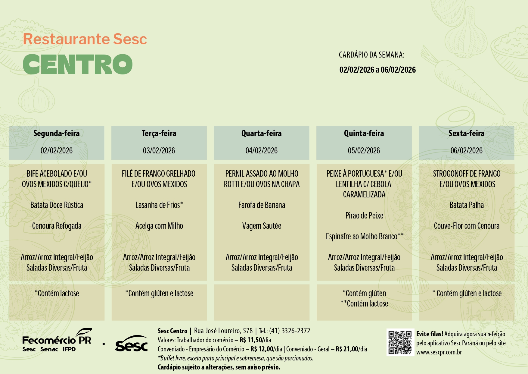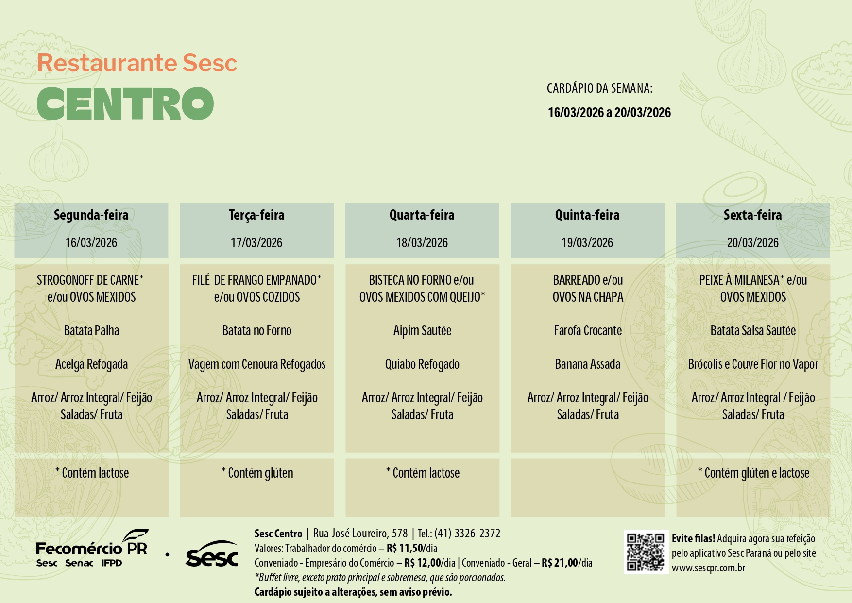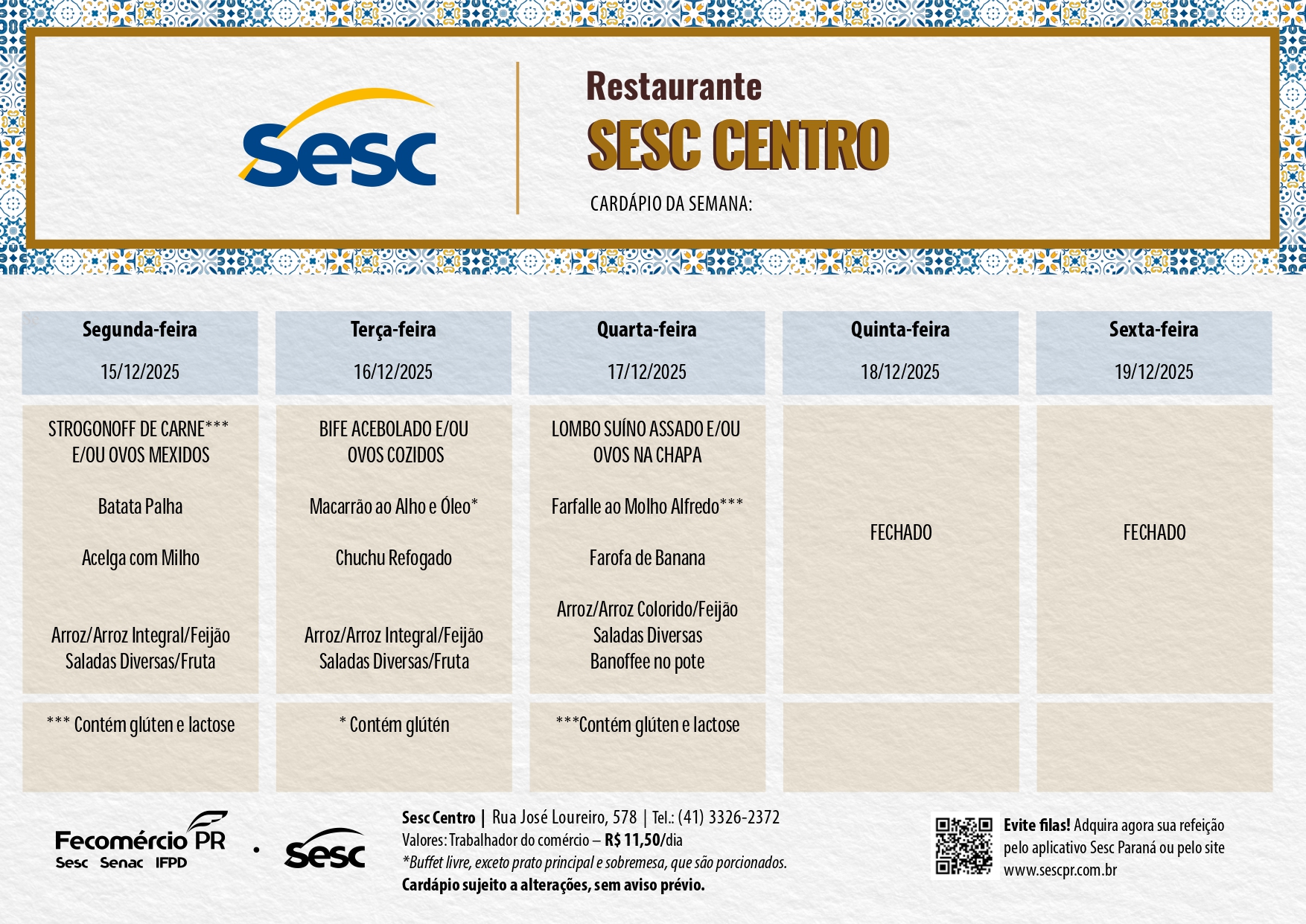 *A capacidade máxima de atendimento do restaurante Sesc Centro é de 600 refeições, portanto, o fechamento pode ser antecipado quando for atingido esse limite.