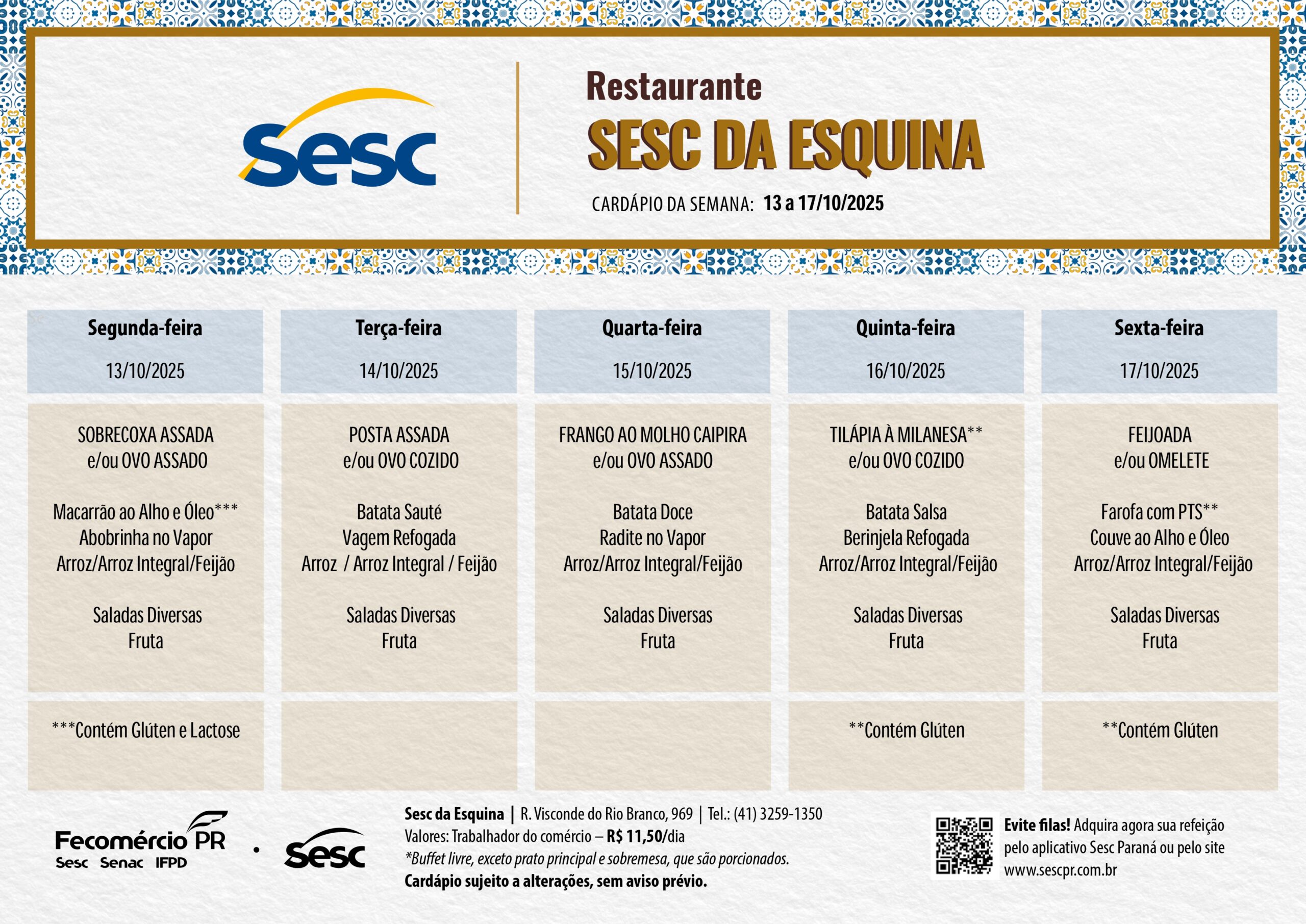 *Atenção – A capacidade máxima de atendimento do restaurante Sesc da Esquina é de 900 refeições (consumo local + viagem). Portanto, o fechamento pode ser antecipado quando for atingido esse limite.