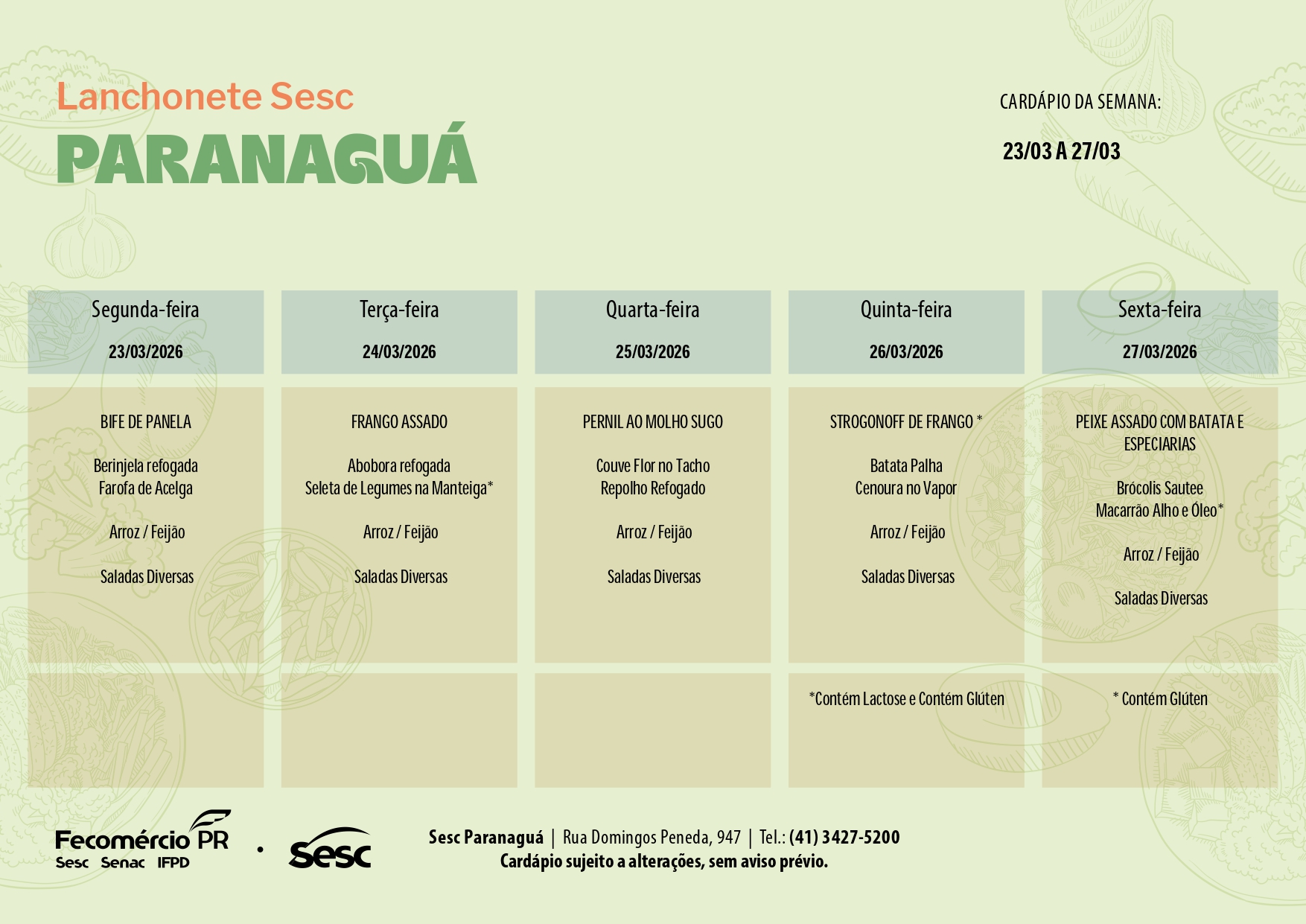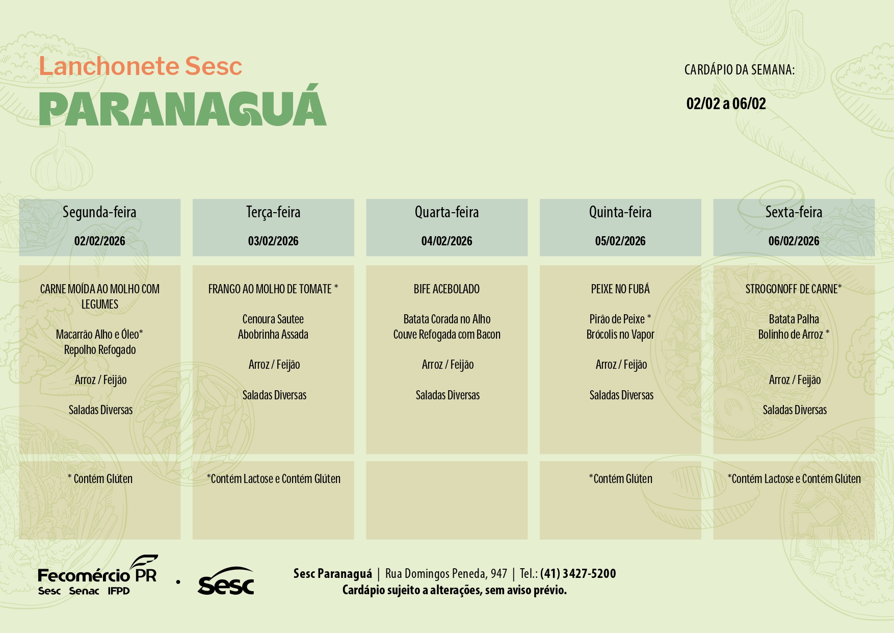 Confira o cardápio na íntegra em nossa unidade e abaixo acompanhe a programação desta semana para o “Prato Completo”: