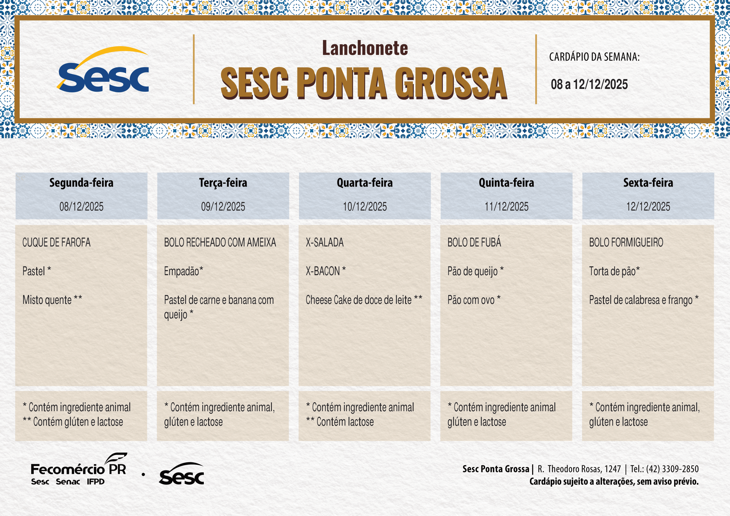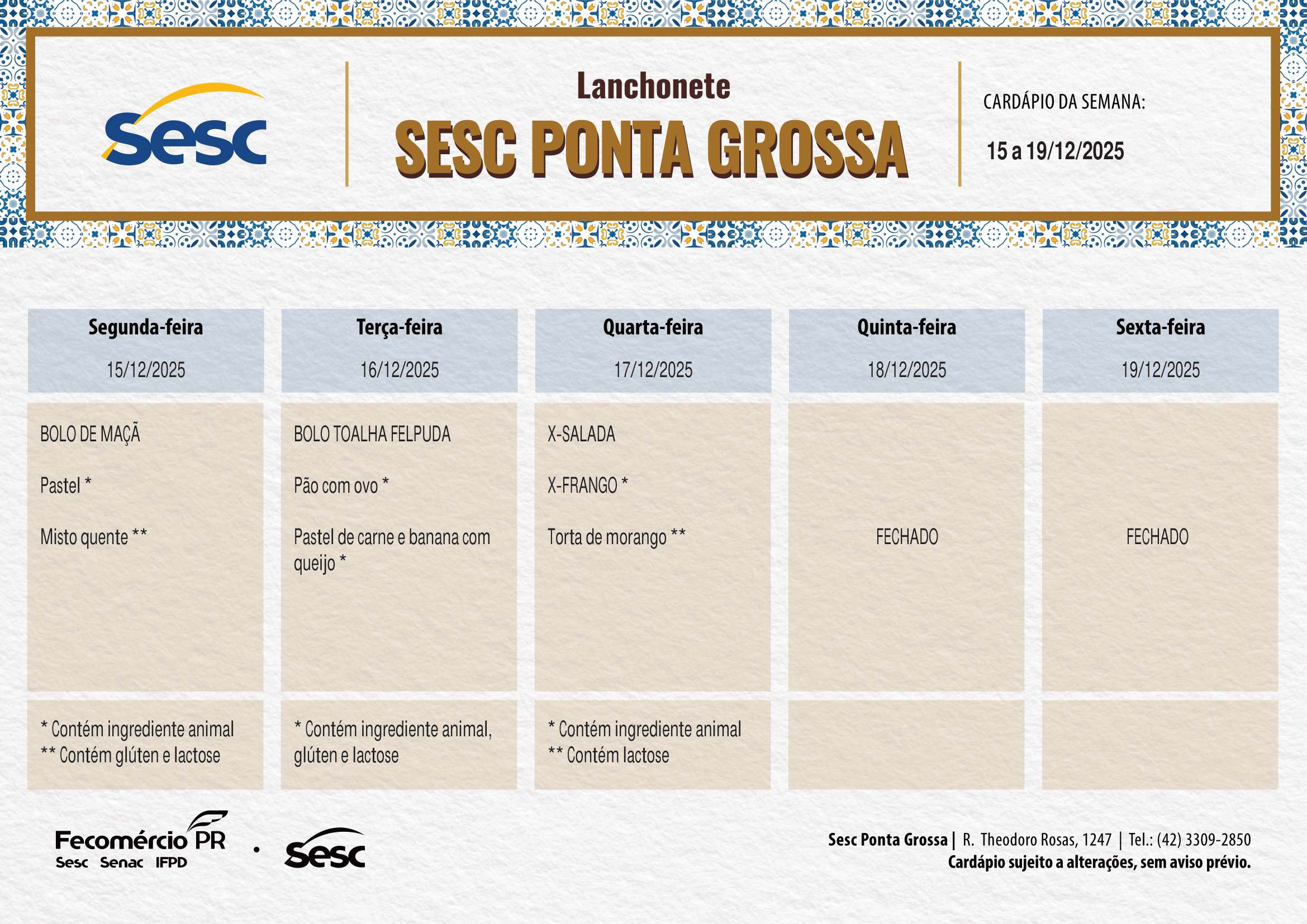 Confira o cardápio na íntegra em nossa unidade e abaixo acompanhe a programação desta semana: