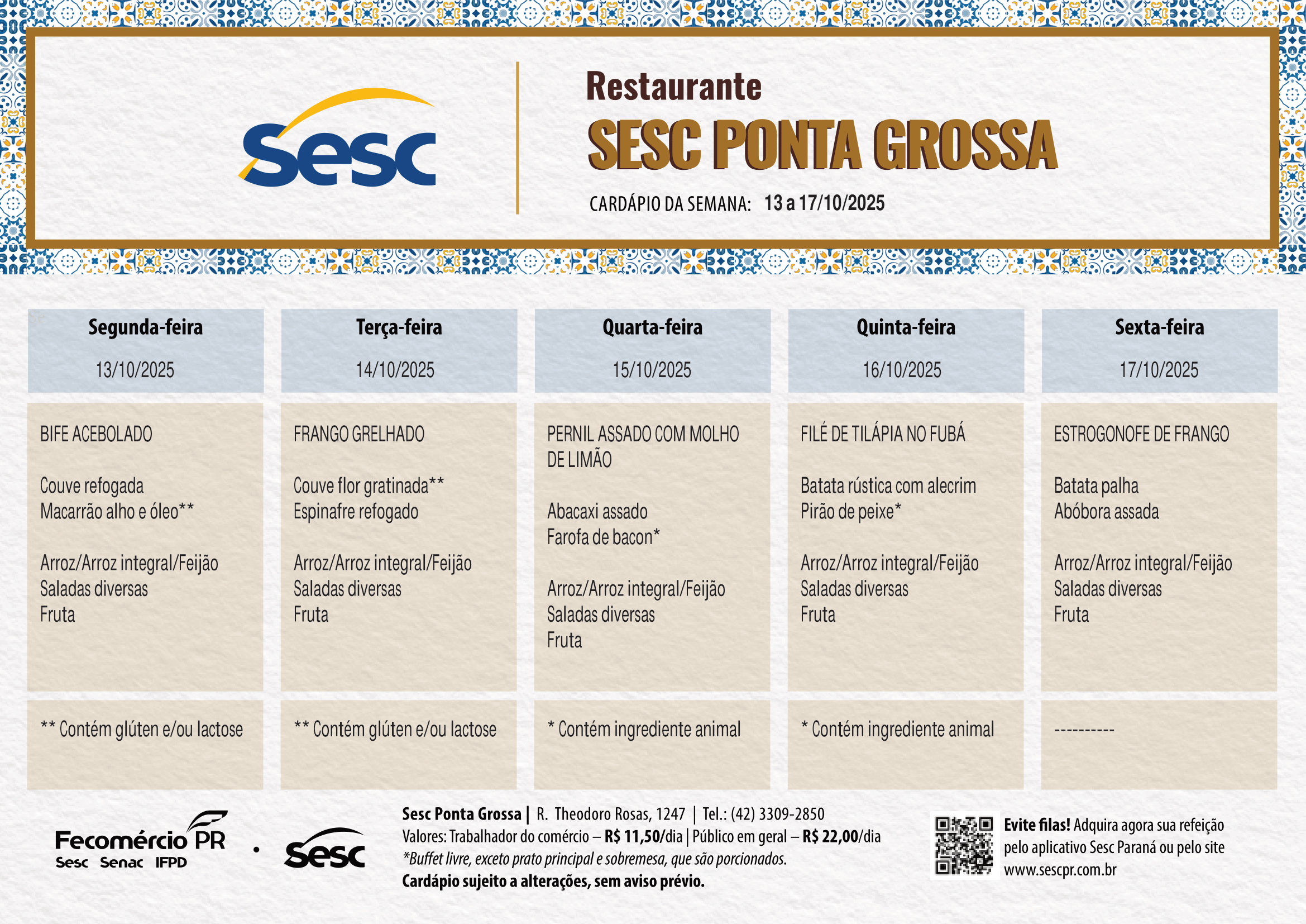 A capacidade máxima de atendimento do restaurante Sesc Ponta Grossa é de 250 refeições (consumo local + viagem).
