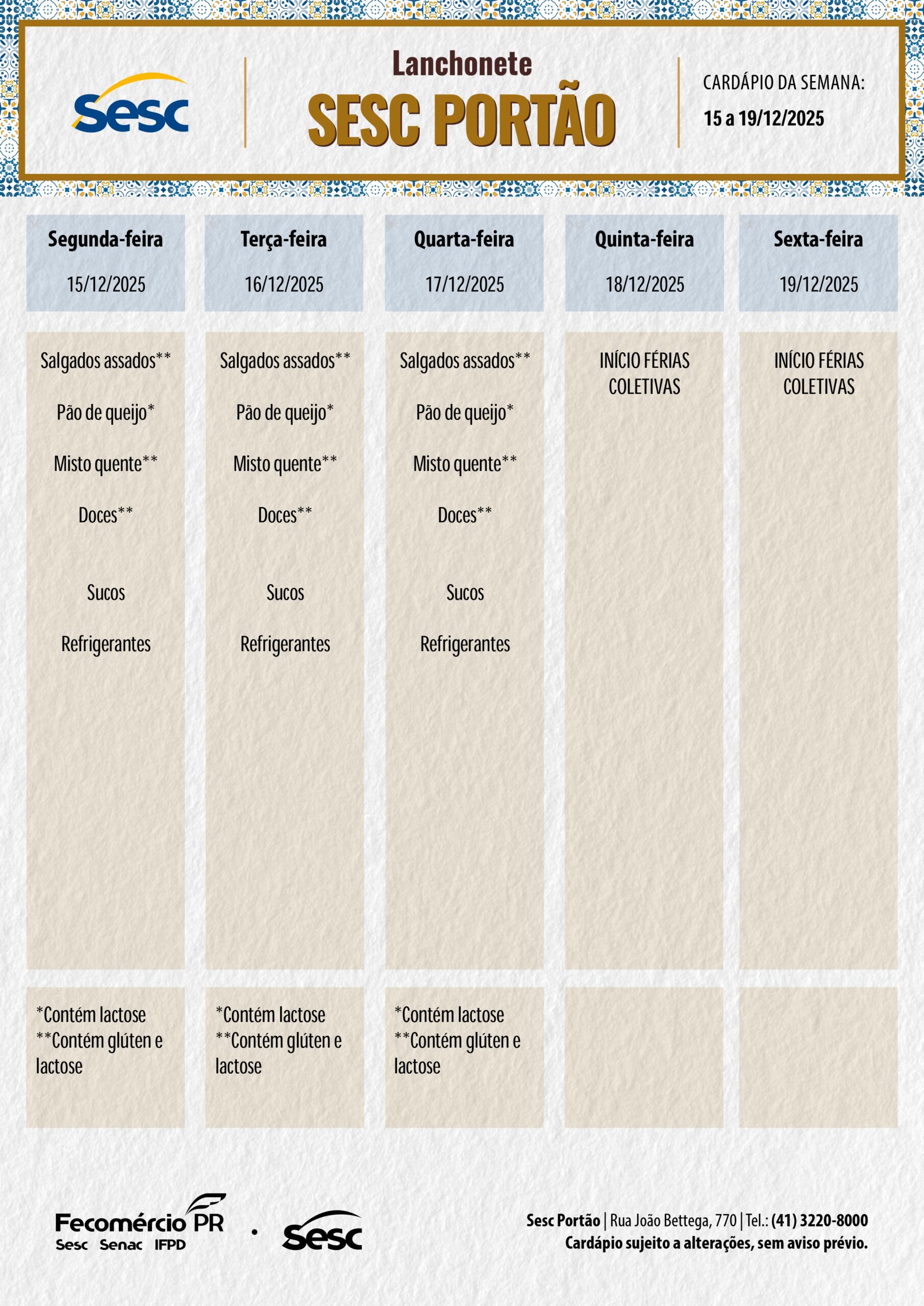 ATENÇÃO! A lanchonete entrará em férias coletivas a partir do dia 17/12/2025, retornando às atividades no dia 26/01/2026.