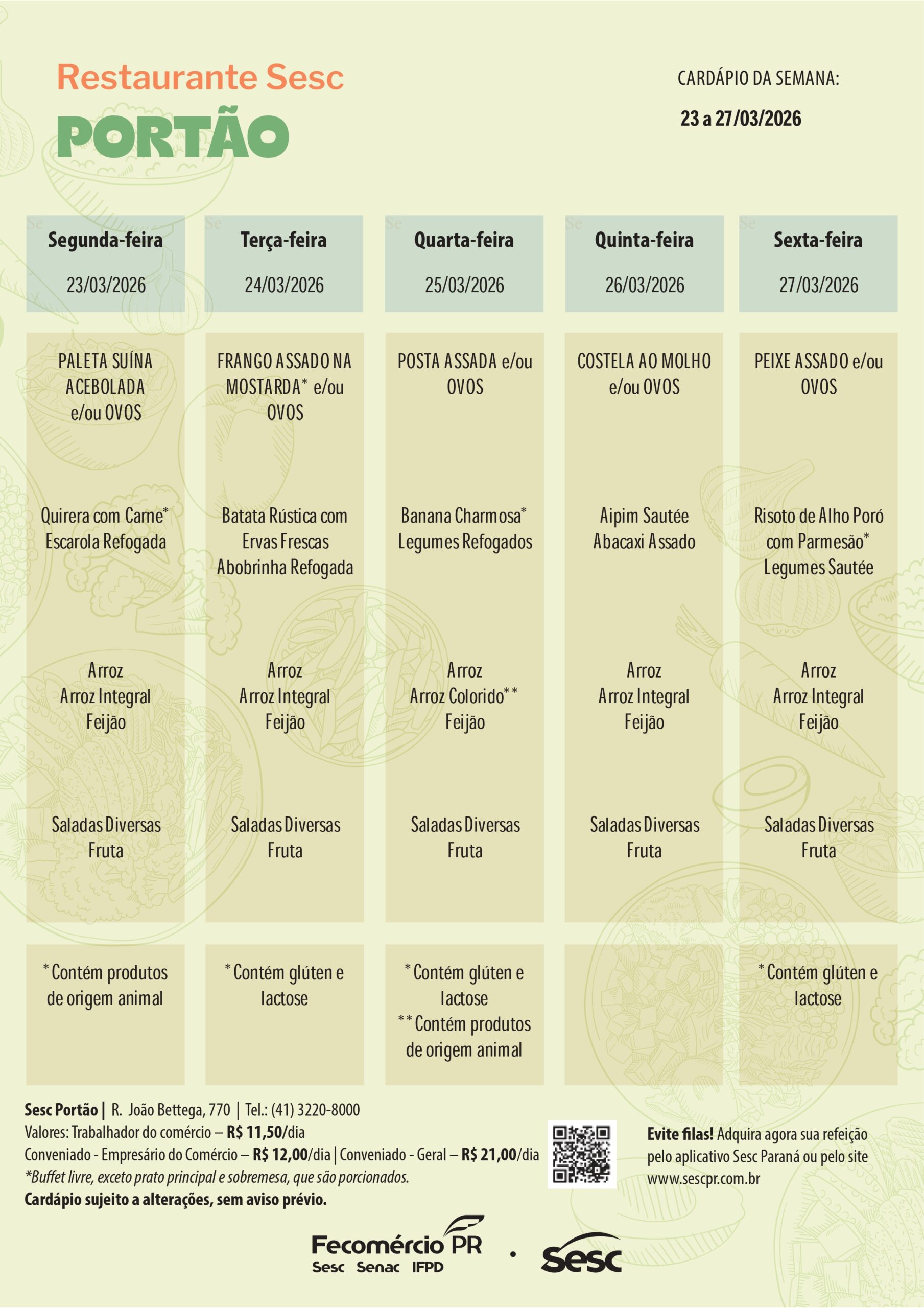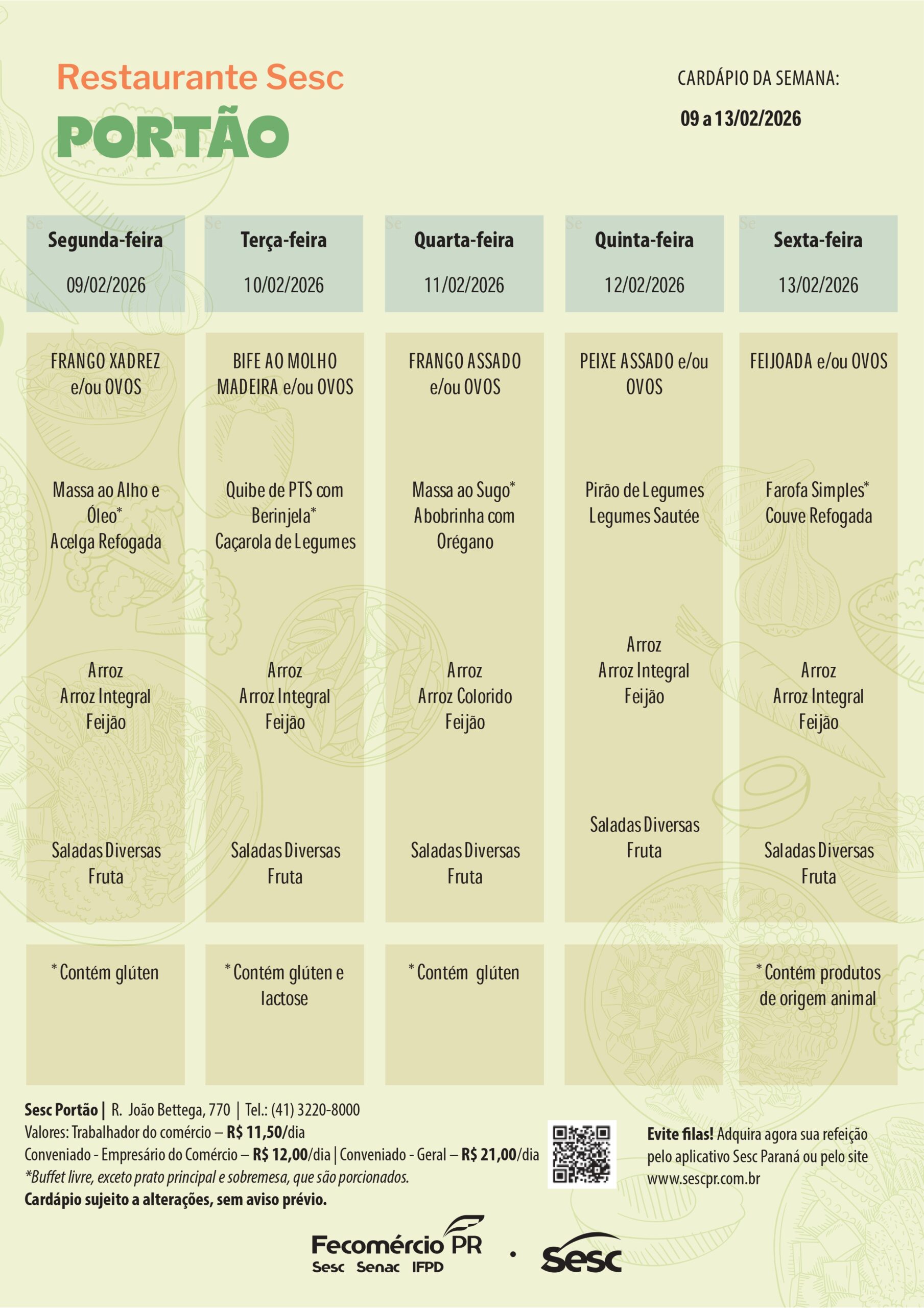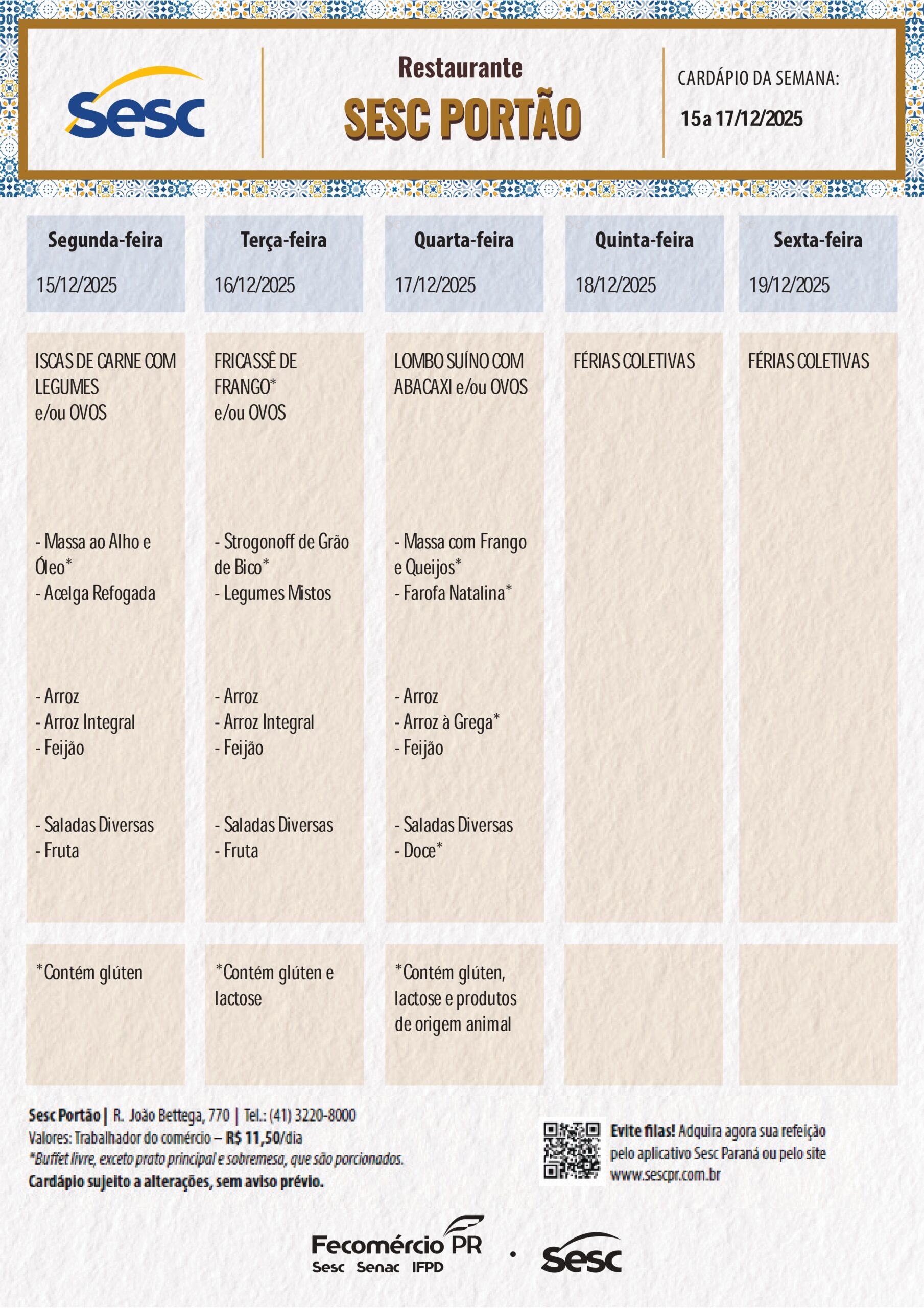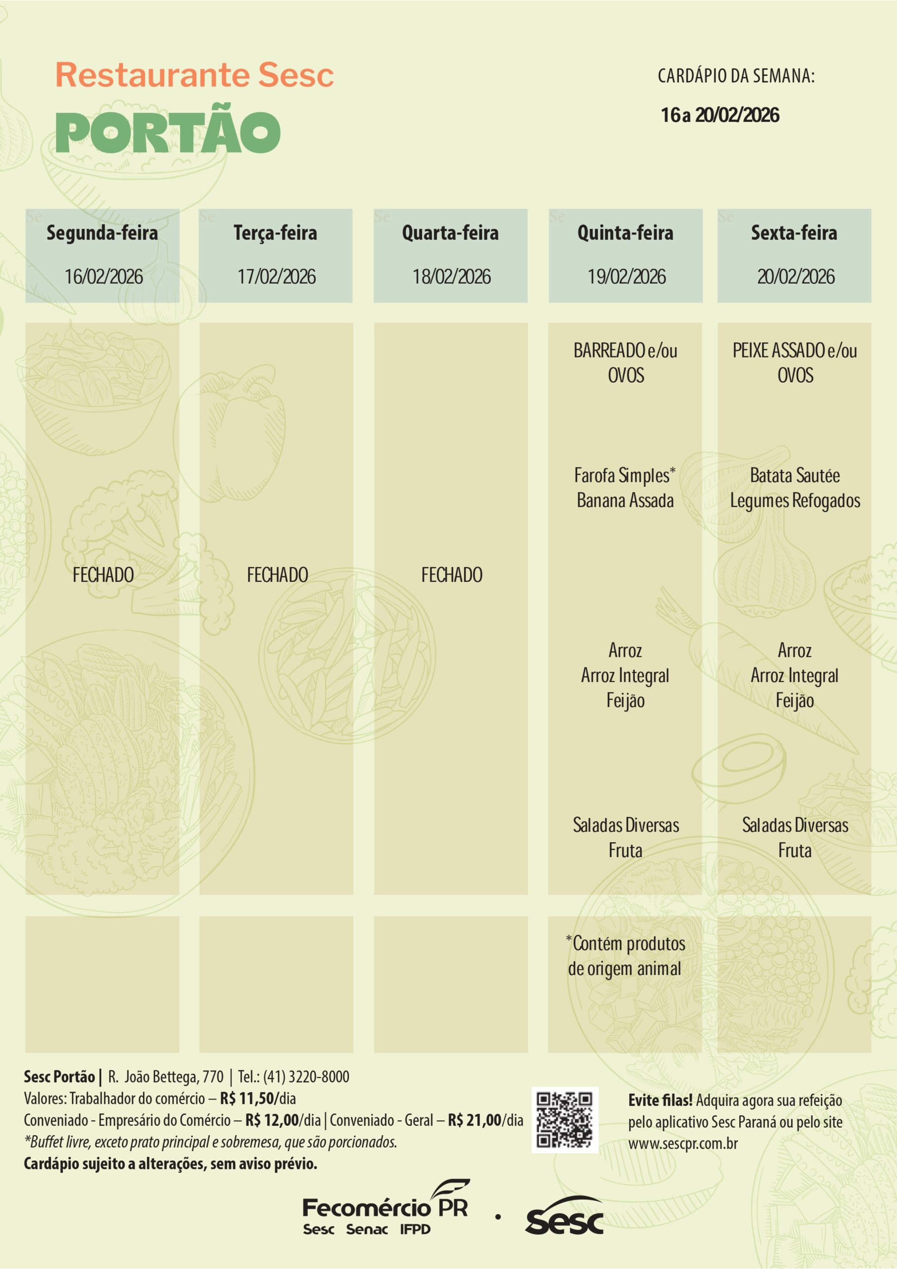 *A capacidade máxima de atendimento do restaurante Sesc Portão é de 230 refeições (consumo local + viagem), portanto, o fechamento pode ser antecipado quando atingido esse limite.